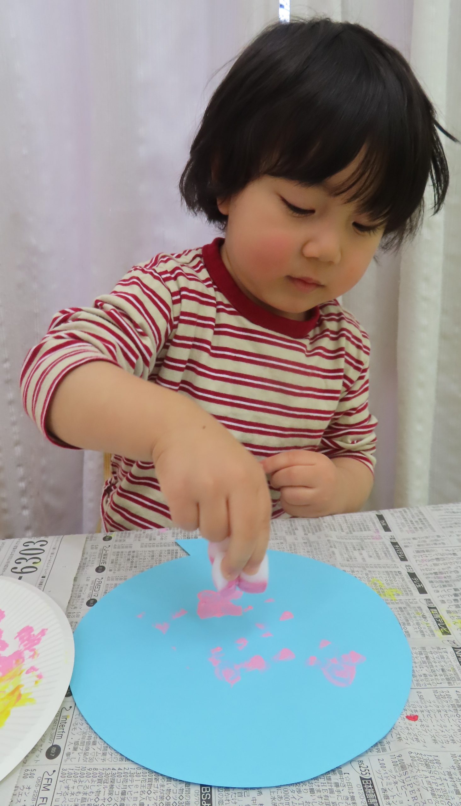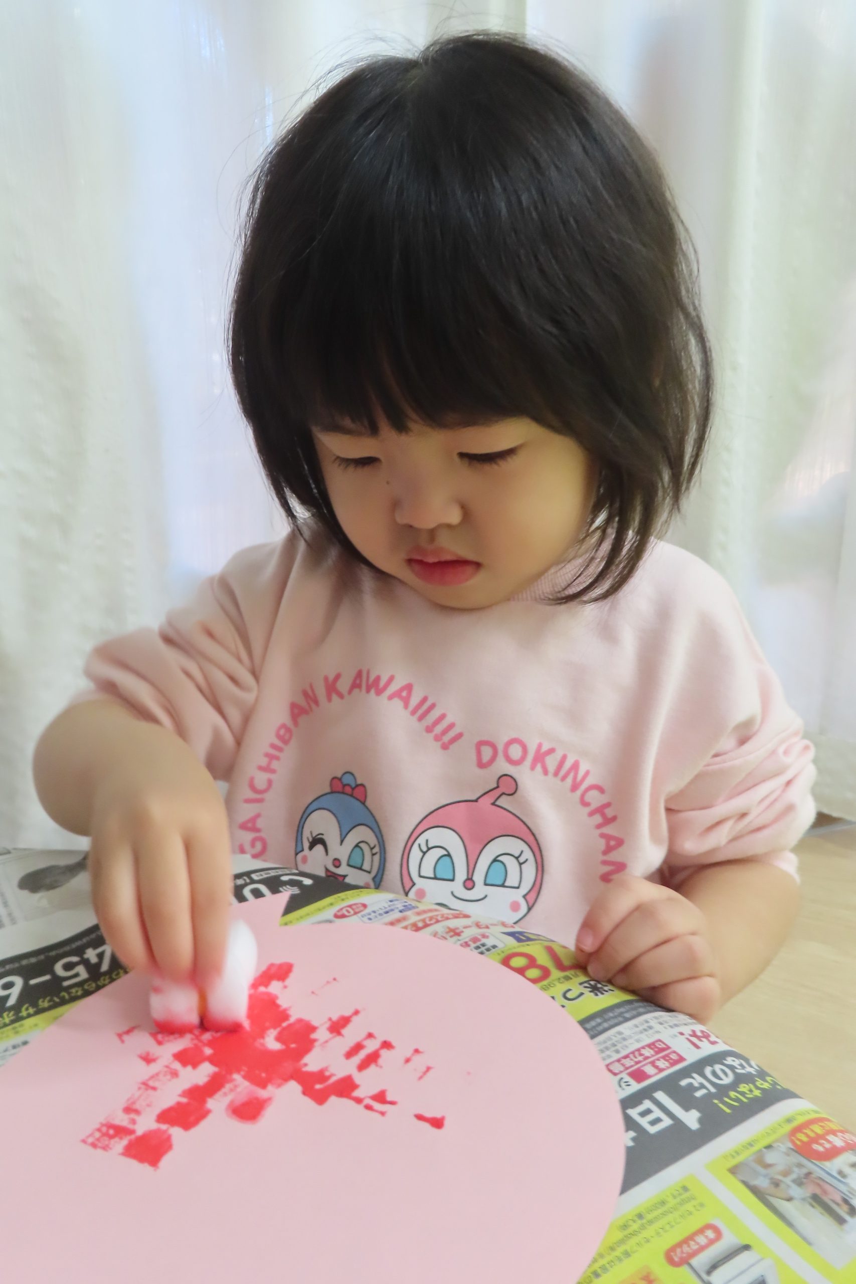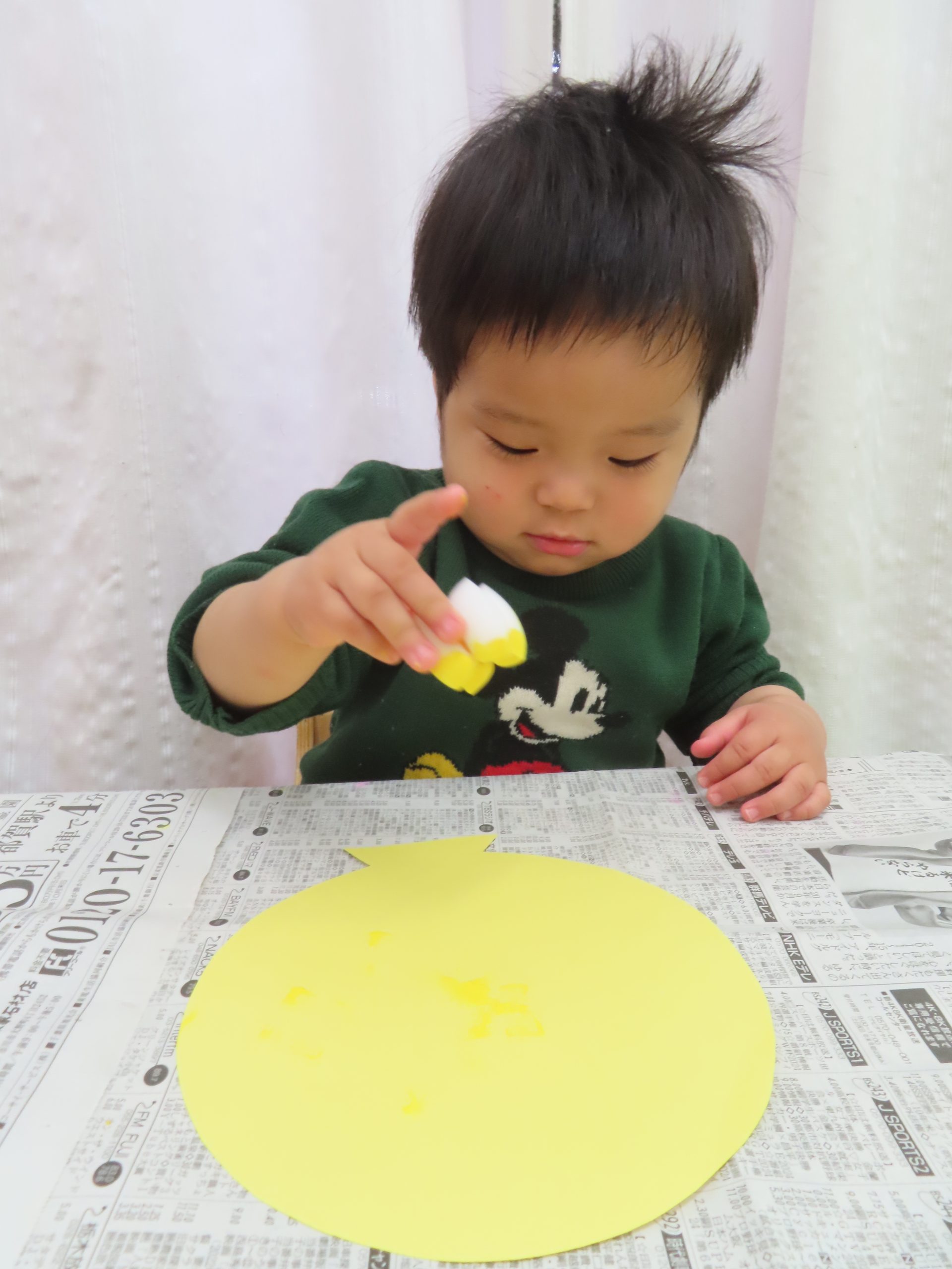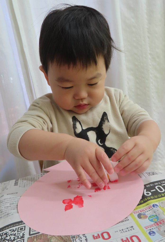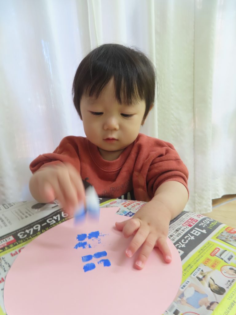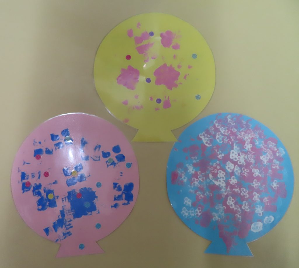 大きくなったね会の壁面で使う風船です。自分で使いたい色の絵の具を選んでもらい、スポンジスタンプをしました。