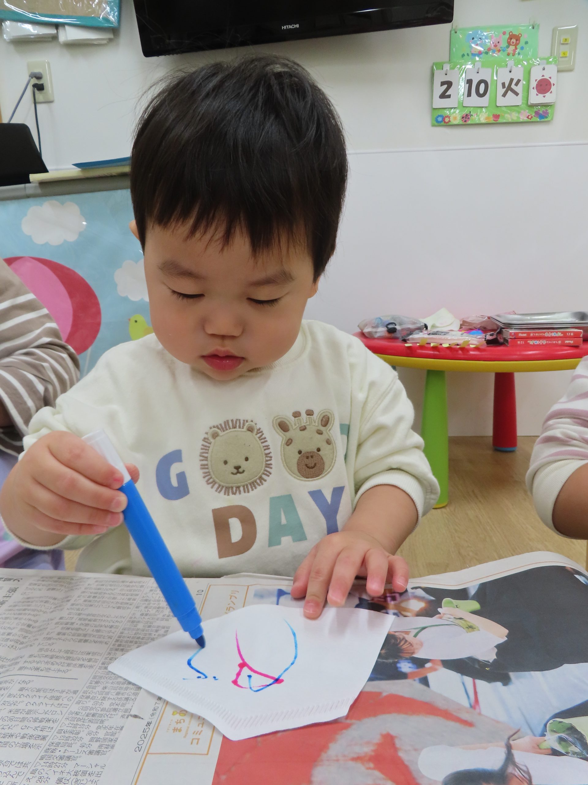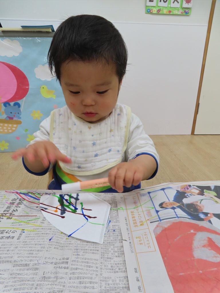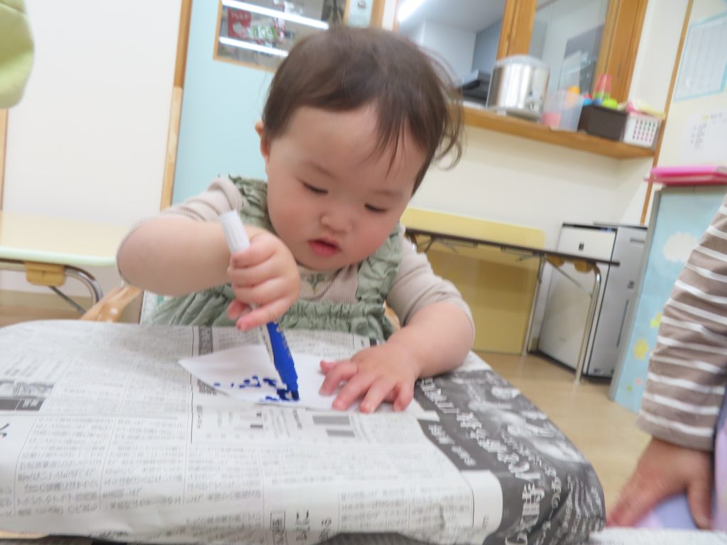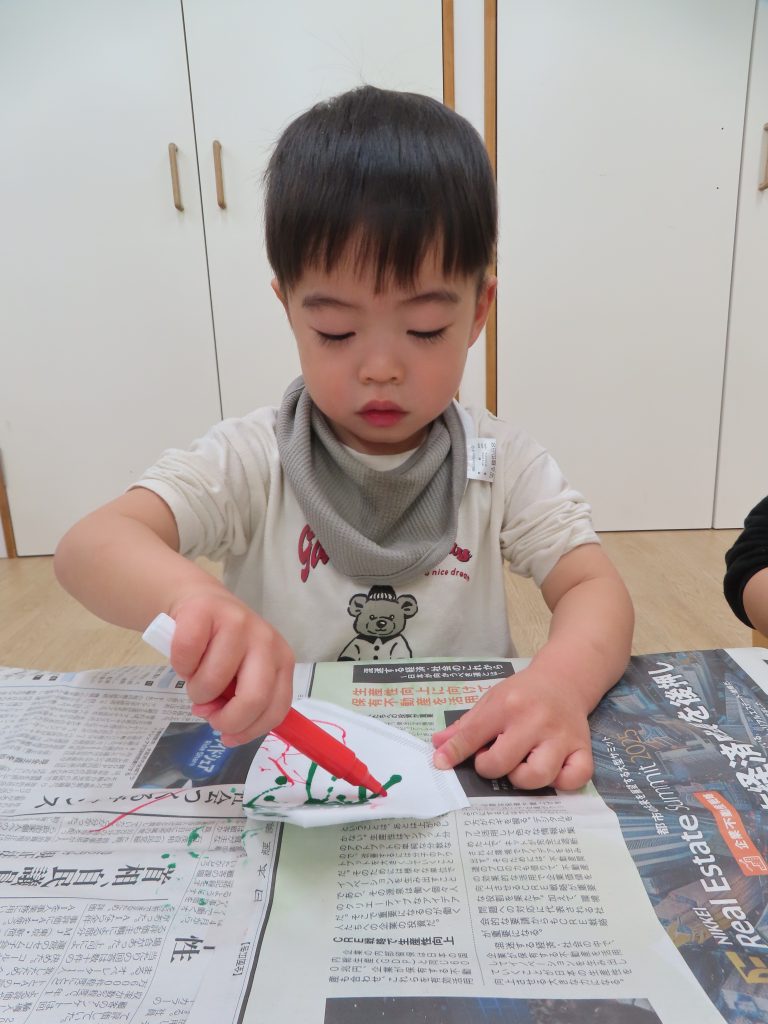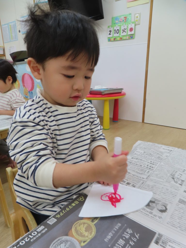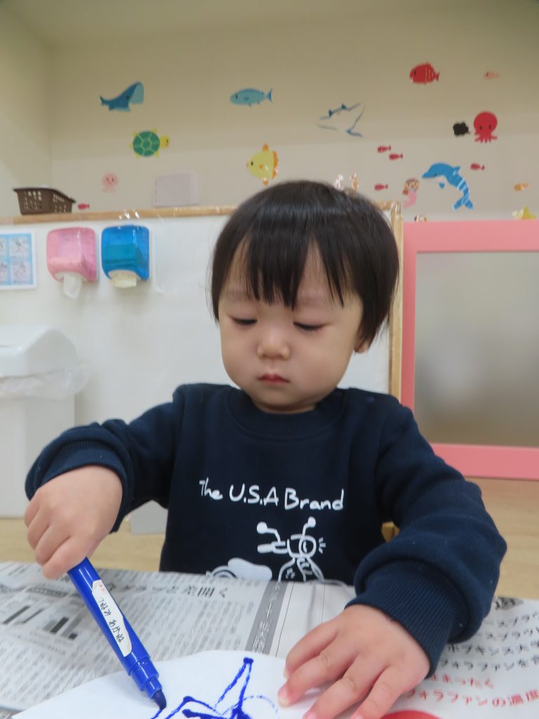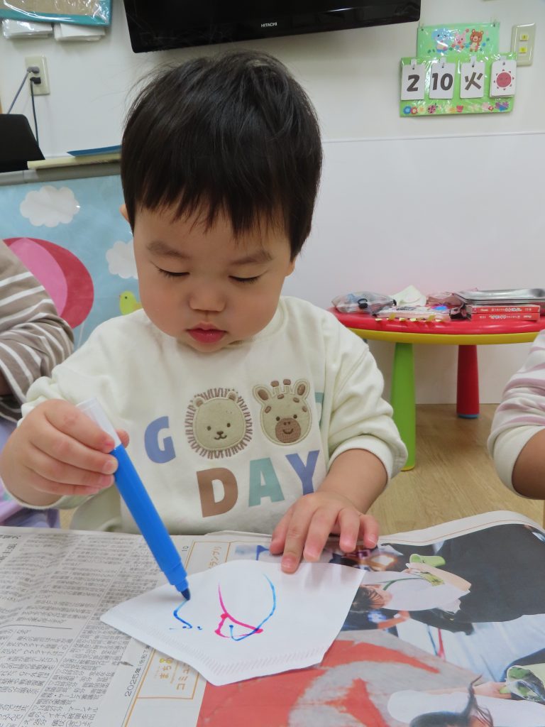 水性ペンでコーヒーフィルターにお絵描きをしました。普段はクレヨンを使うことが多く、ペンを使うことが楽しかったようでペンを離そうとしませんでした。