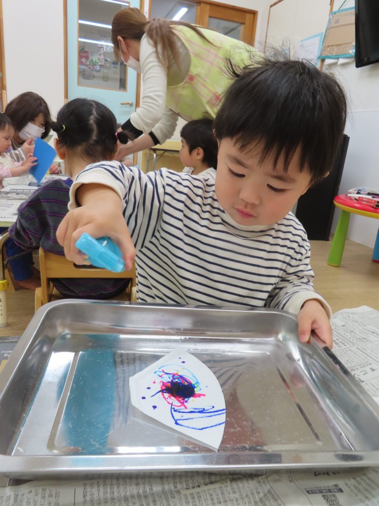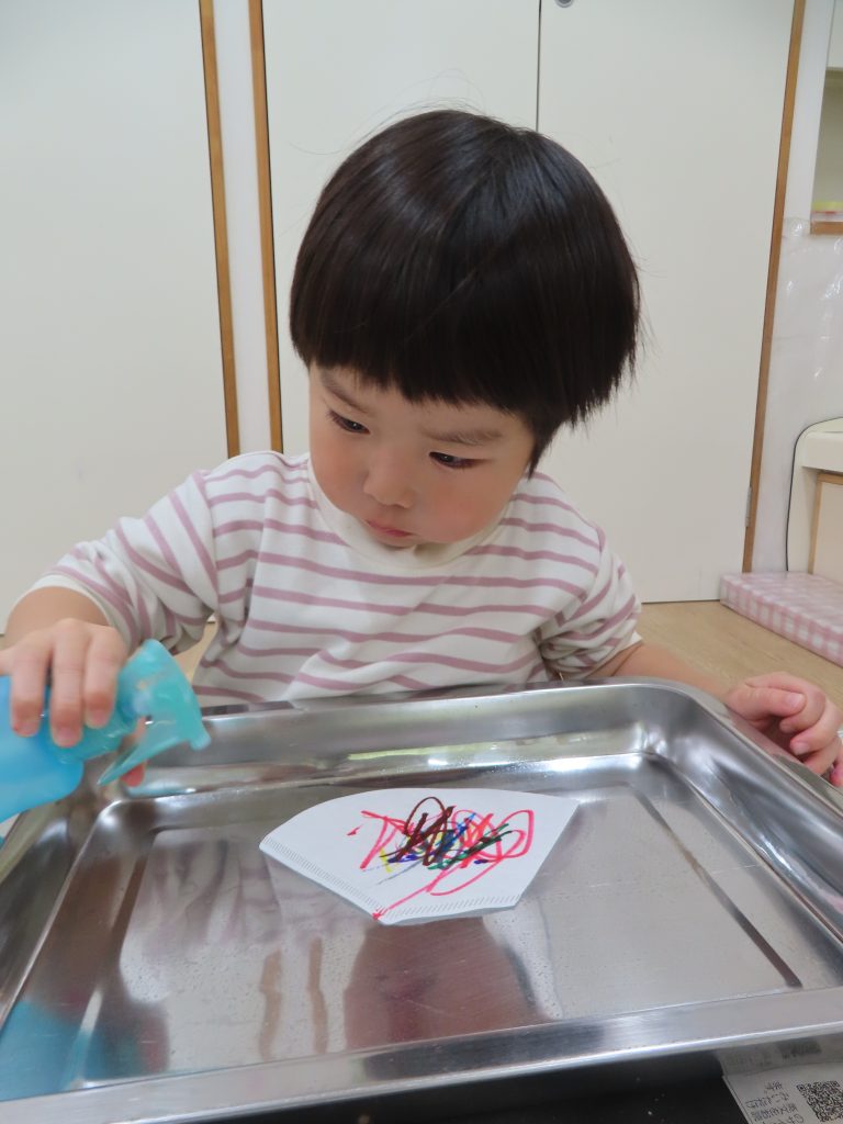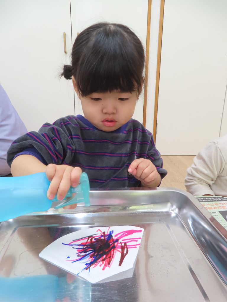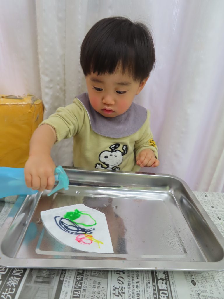 スプレーの穴を見ながらスプレーを押してしまい、顔にお水がかかってしまう子もいました😲