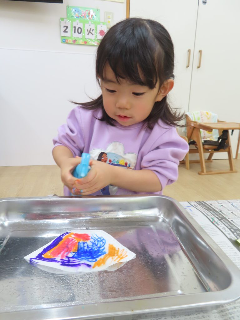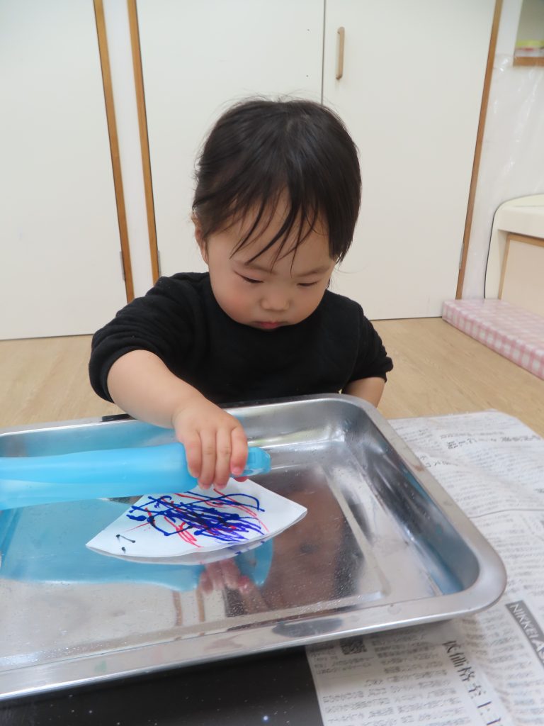 ペンが水でにじんでいくところをよく観察していました。