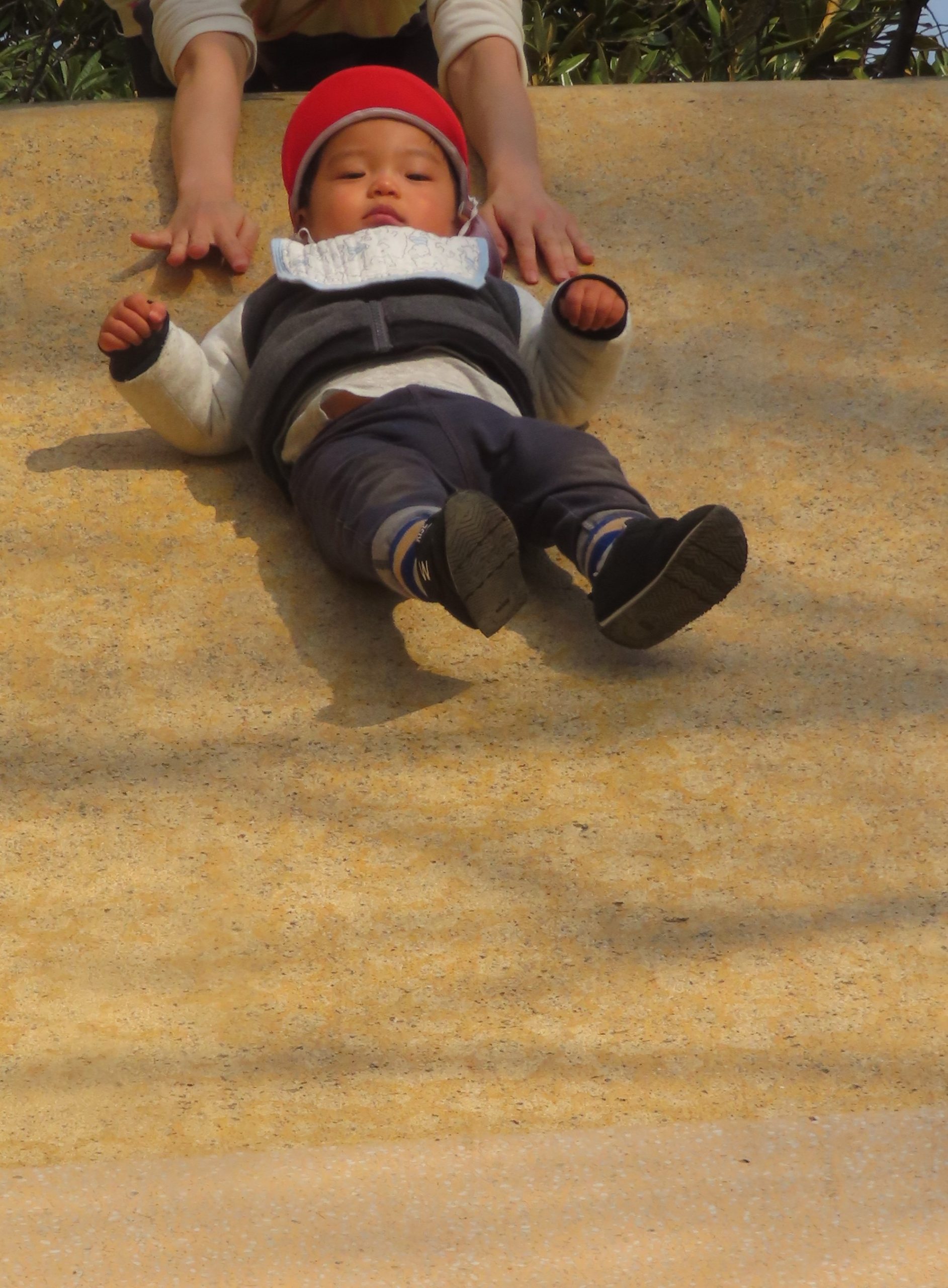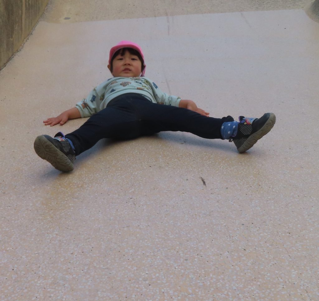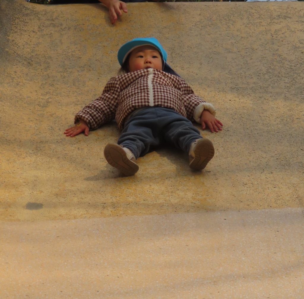 八雲公園の大きな滑り台を夢中で滑っている子どもたち。笑顔で滑る子、真顔の子と様々な表情を見ることができて微笑ましかったです😊