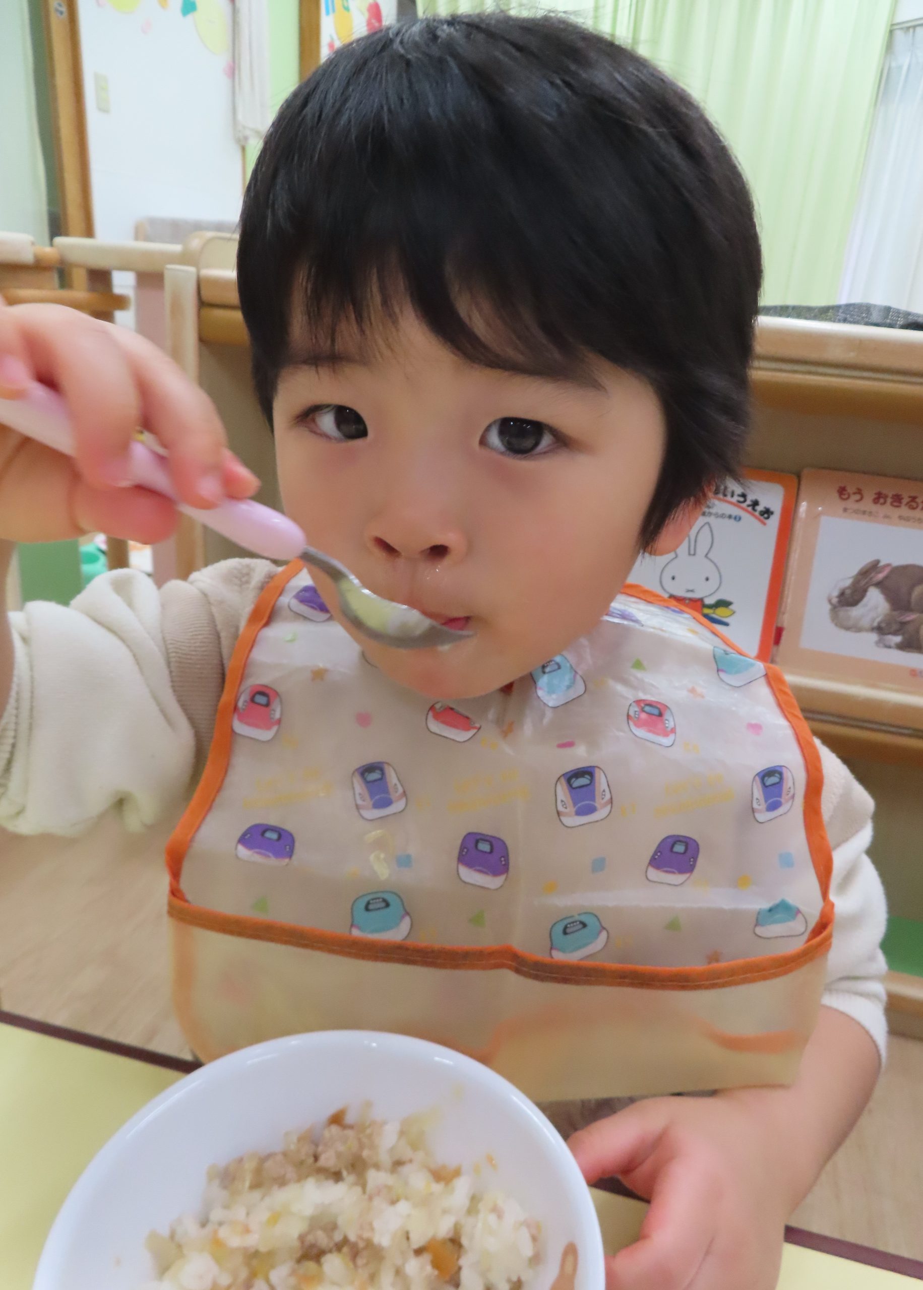 子どもたちが大好きな春巻き丼を食べているときの写真です。大好物を食べているときのお給食は静かです😂