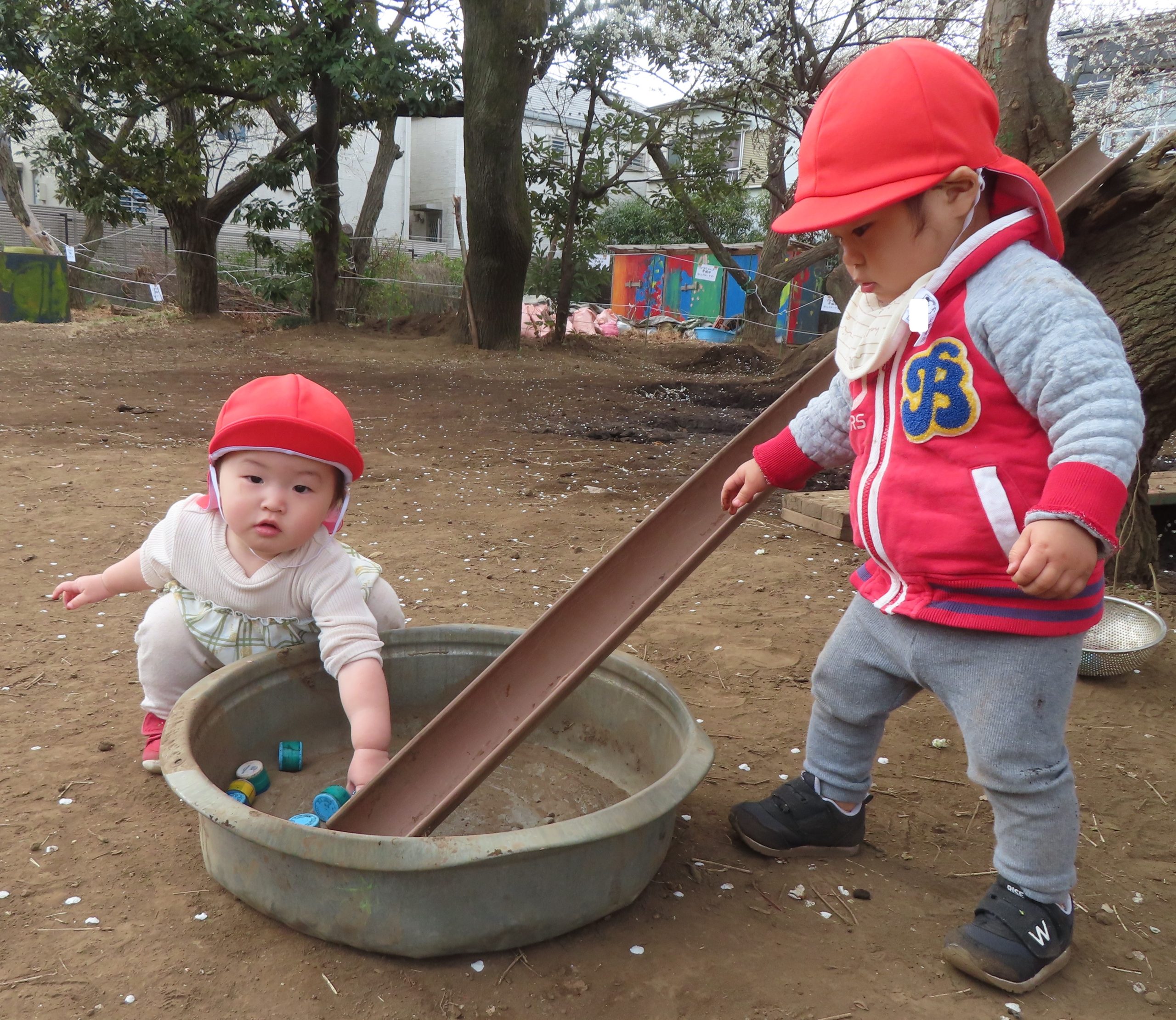 泥がたくさんあるところでは、工事ごっこが始まっていました。