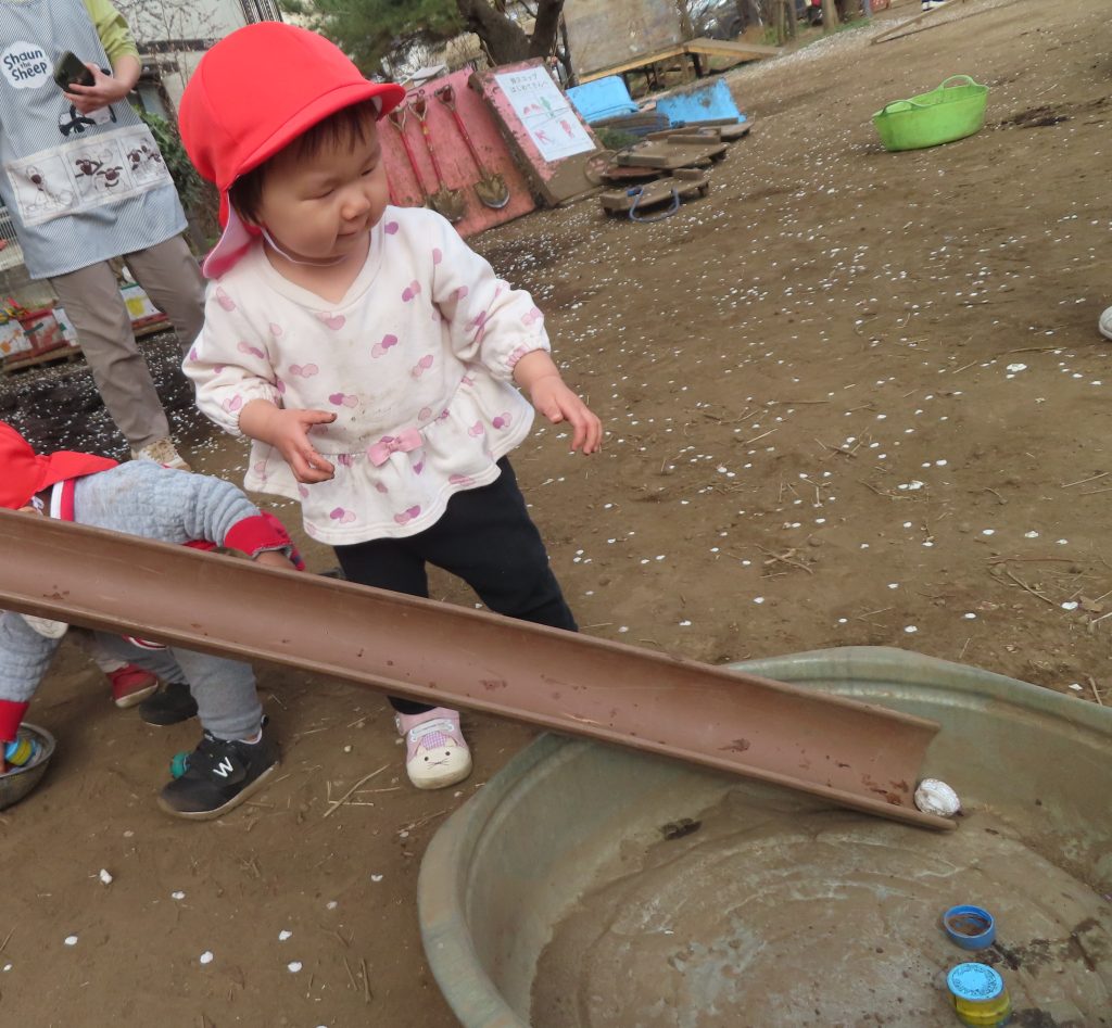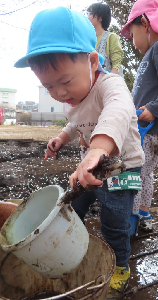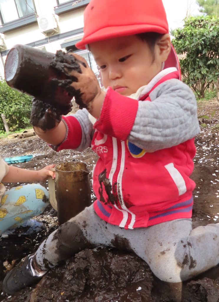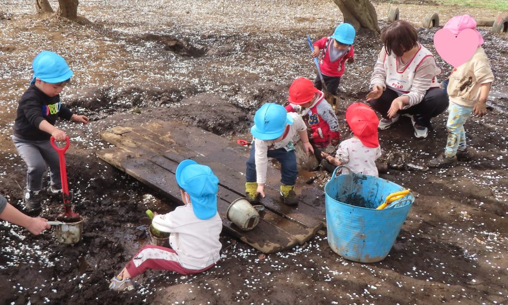 泥がたくさんあるところに喜んでいく子、汚れないように遊ぶ子など反応が様々な子どもたち。汚れないように遊んでいた子も友だちの影響からか徐々に汚れることを恐れず遊べるようになりました。