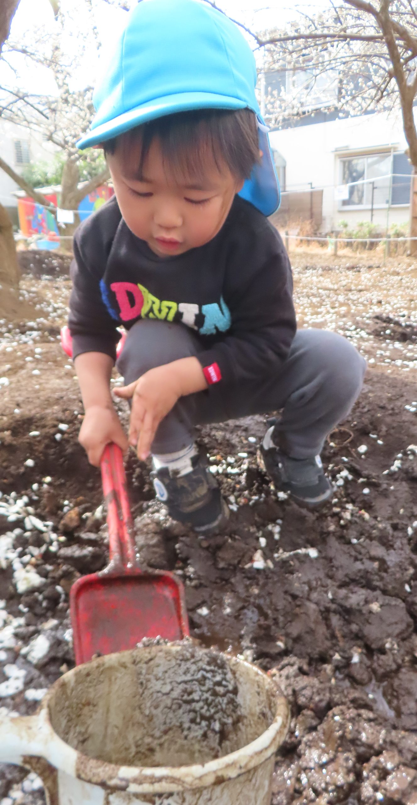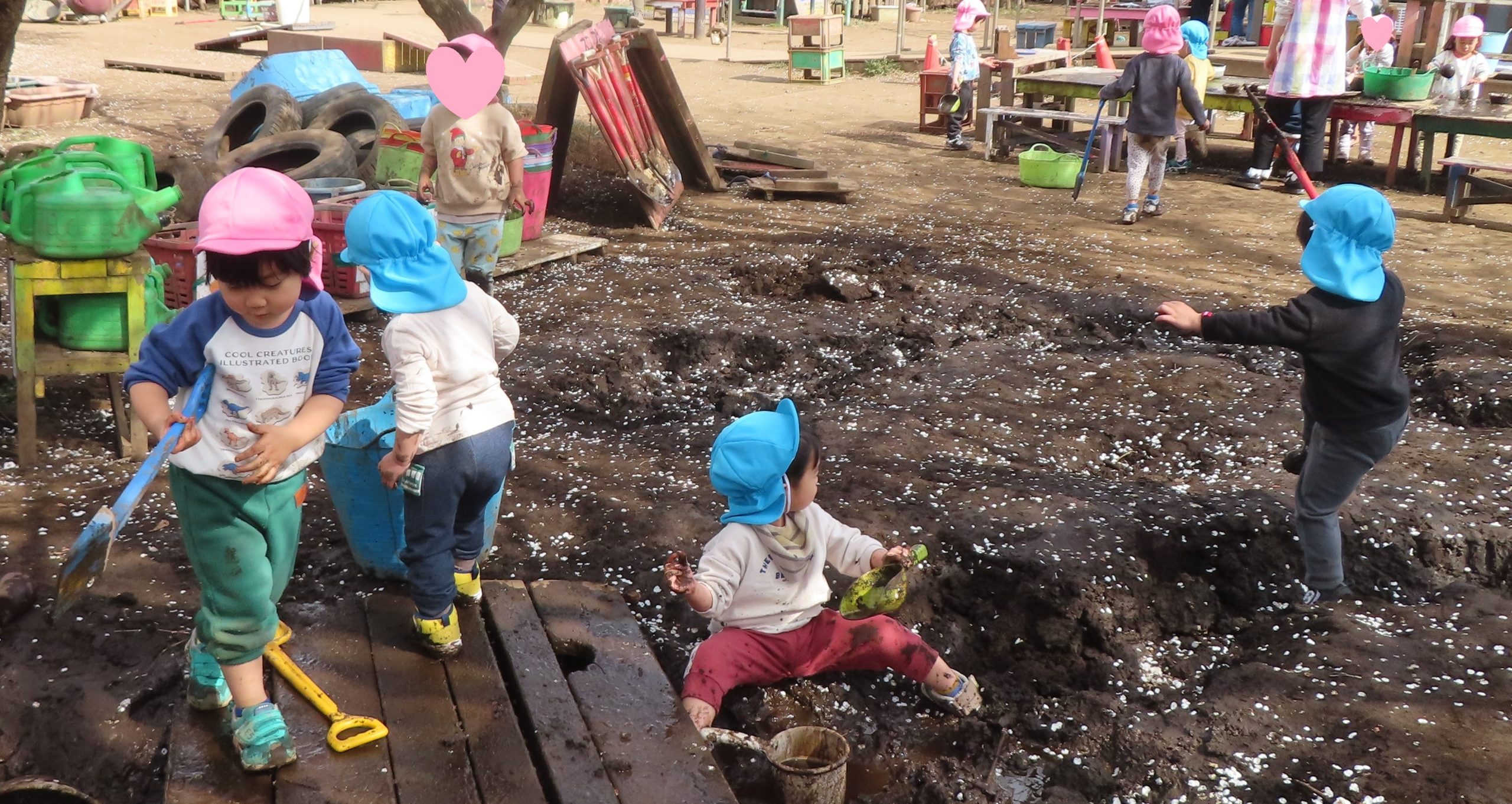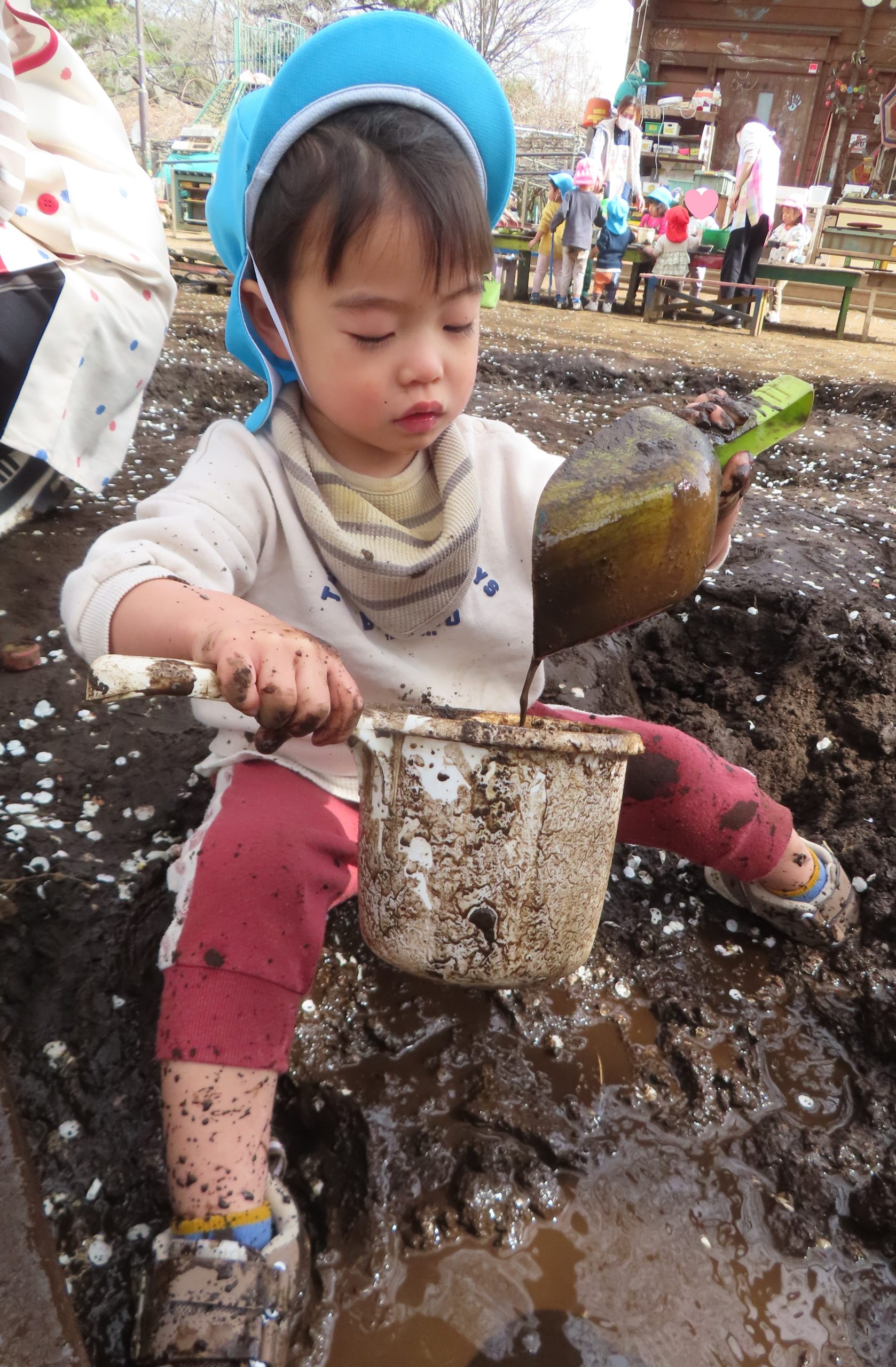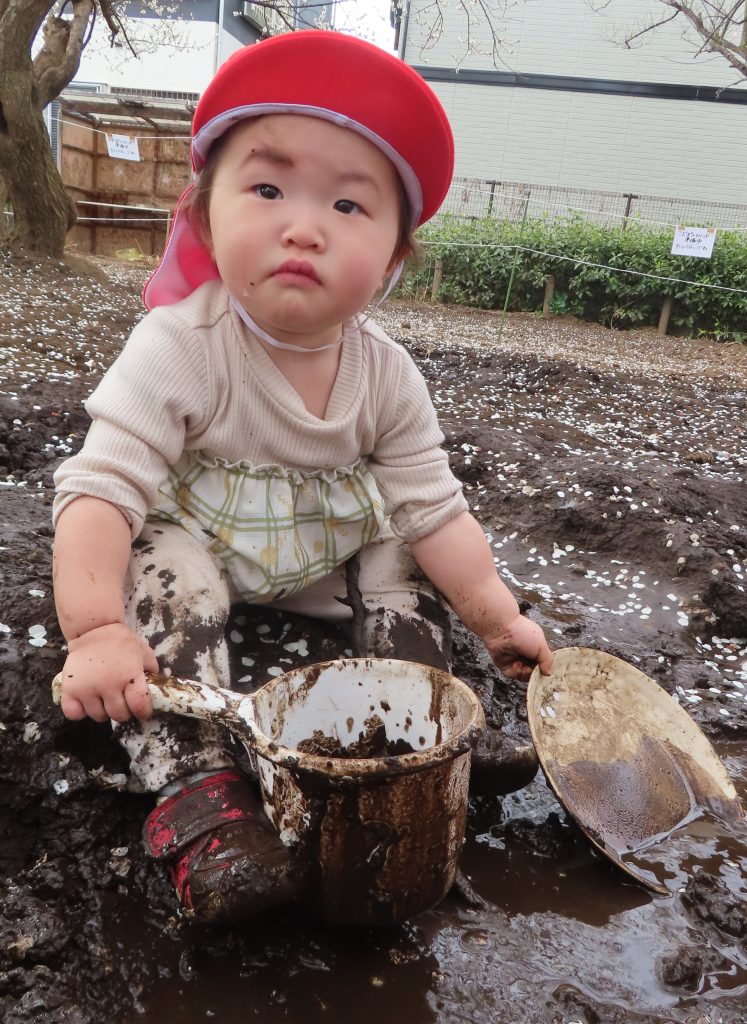 保育者も一緒にシャベルで泥を掘っていると「いっしょだね!!」と嬉しい声が聞こえてきました✨