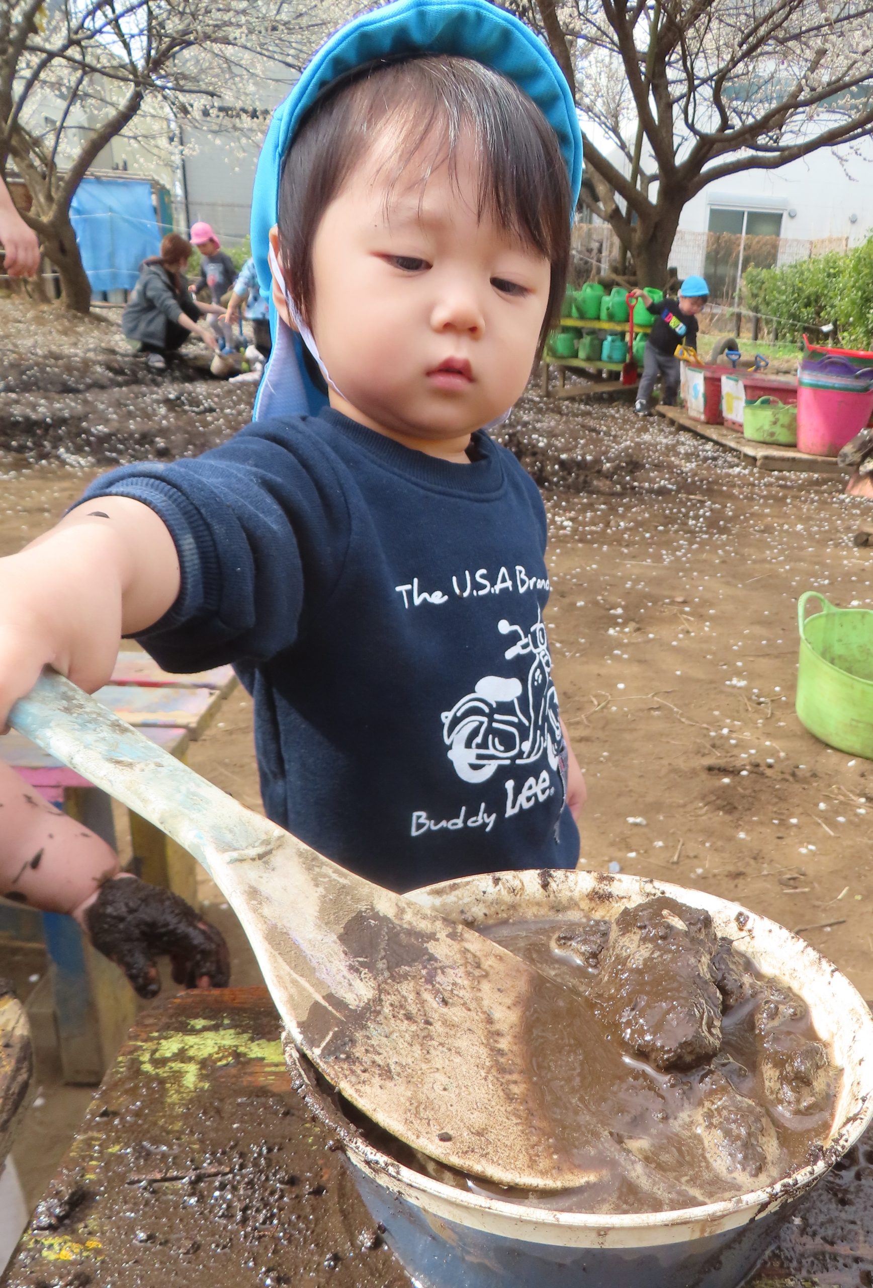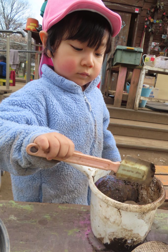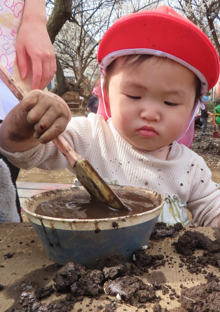 泥とお水をまぜまぜ……みんな真剣な顔でお料理ごっこです🍳