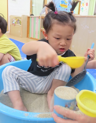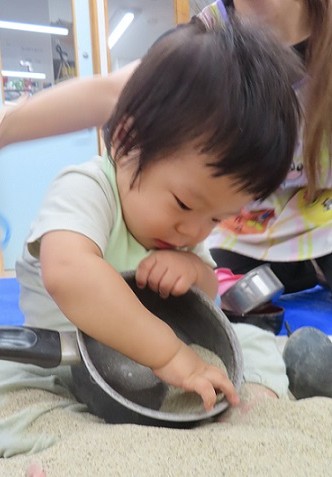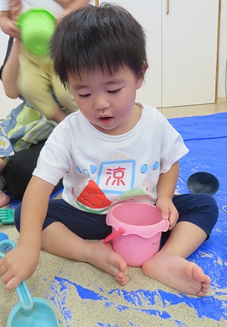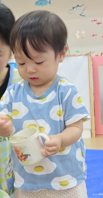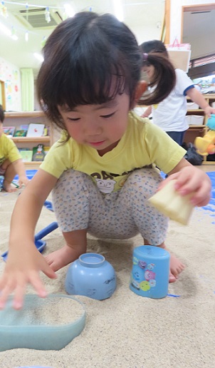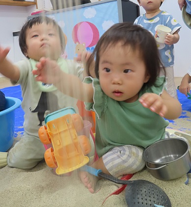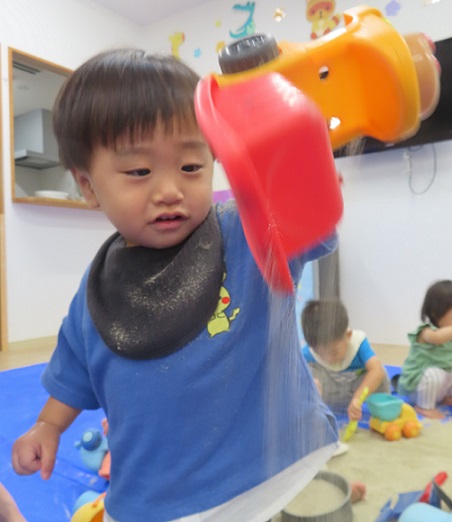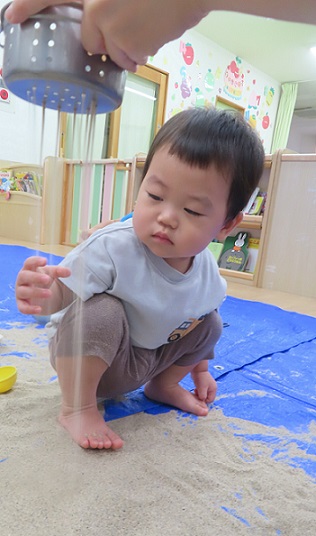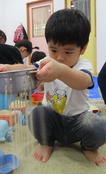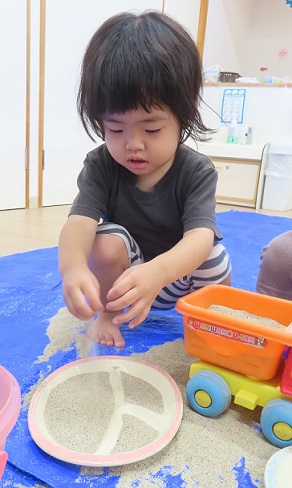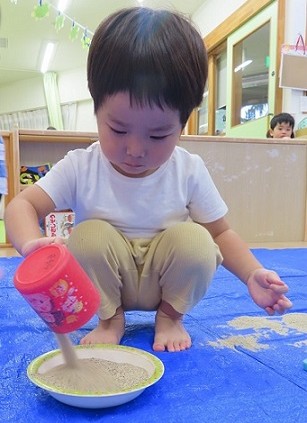 室内で砂遊びをしました。お椀やコップにたくさんの砂を入れると、上からサーっと流れるようにこぼして遊ぶ子どもたち。砂のお山の上を裸足で歩くなど感触を楽しんでいました。