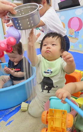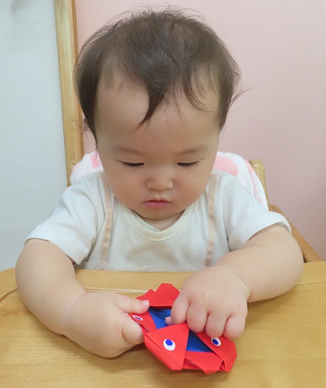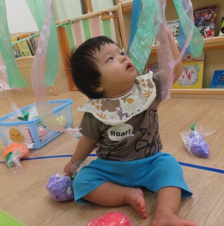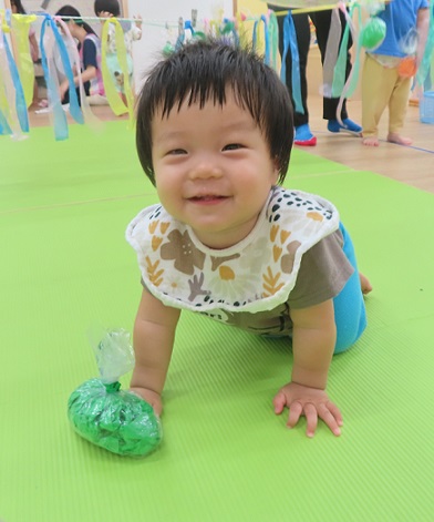喃語で友だちに話しかけたり、手を握ったりと自分からやり取りをする姿があり、楽しそうにしていました。