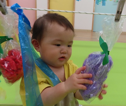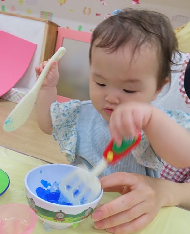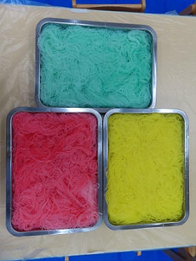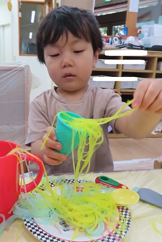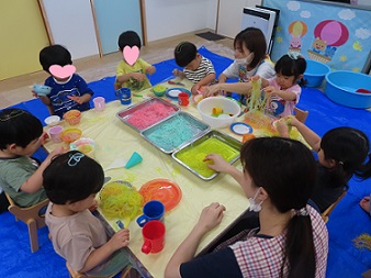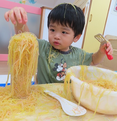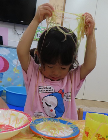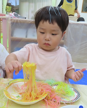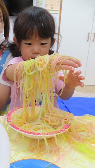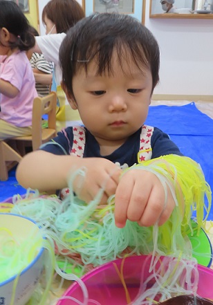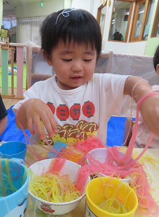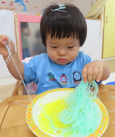 緑・黄・赤の春雨を用意しました。特に黄色が人気で、「めんめん!」と大喜び!ソフトクリームのカップに入れて「バナナアイス~!」など色から見立てあそびをして楽しんでいました。
