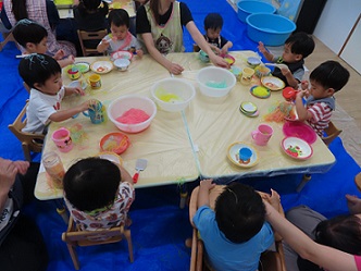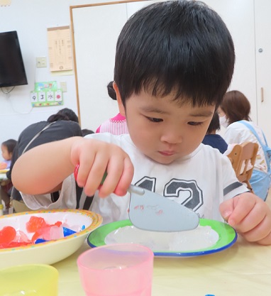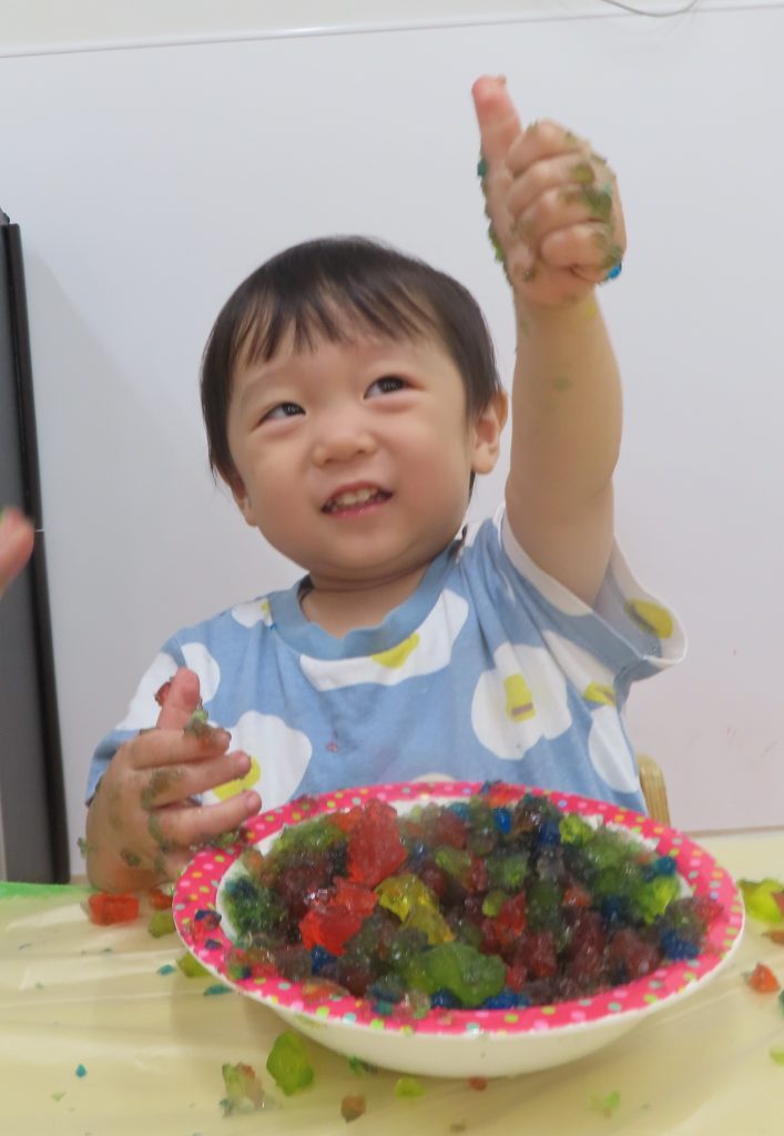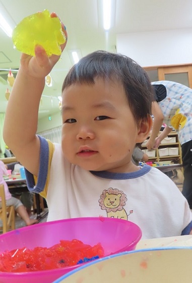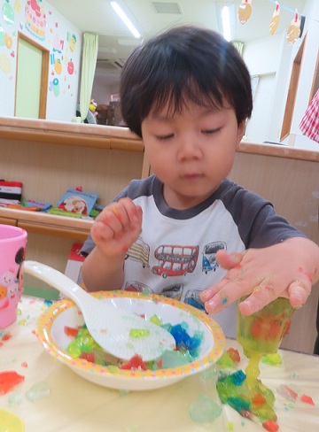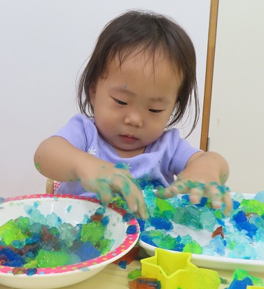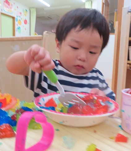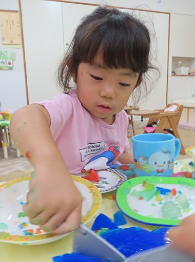 寒天でお皿を山盛りにする子や寒天を頬につける子など様々な遊び方を見せてくれました。