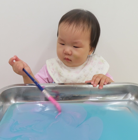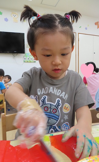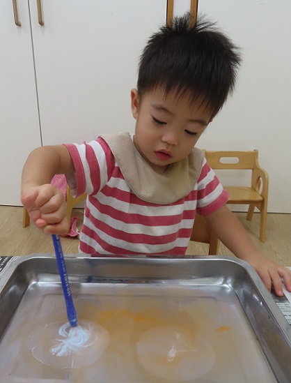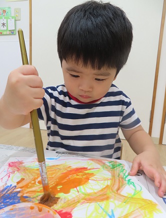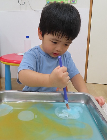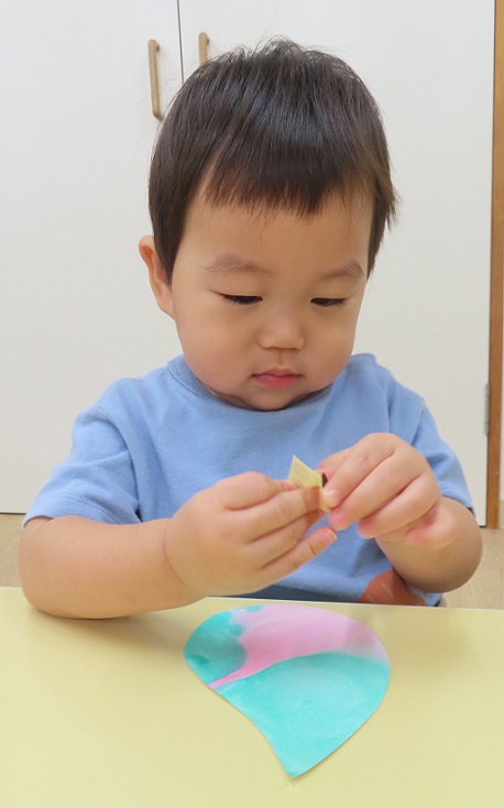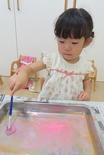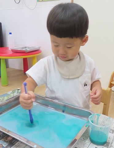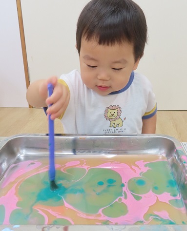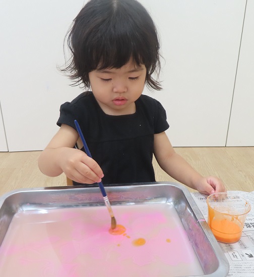 緑や水色、赤、ピンク等好きな色の絵の具を混ぜ、画用紙を上からつけてゆっくりあげていくと・・