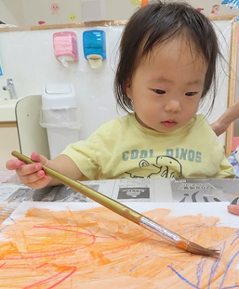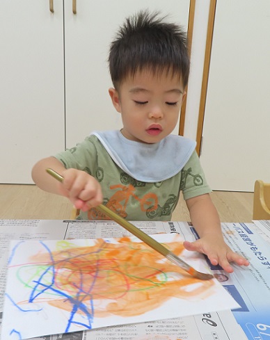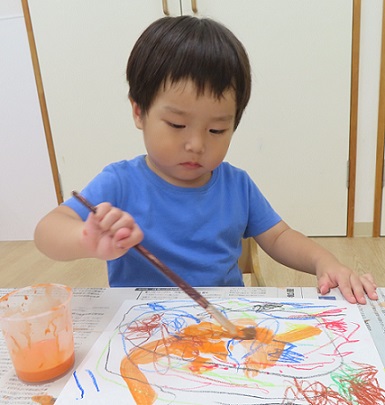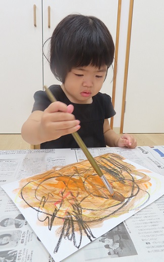 オレンジの絵の具でクレヨンのはじき絵をしました🖍画用紙全体に絵の具を広げ、色鮮やかな作品に