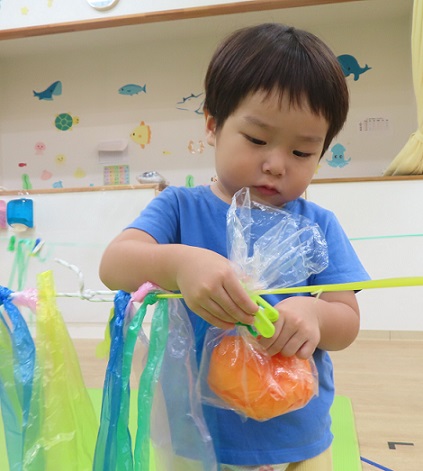 リンゴ、ミカン、ブドウなどの様々な果物が紐に吊るされた状態を見ると、「りんごあった!」と見つけた果物を言い合う子どもたち。果物狩りのスタートです!りんごだけ集める子や胸に抱えるほど多くの果物を集める子など、みんな楽しんでいました。
