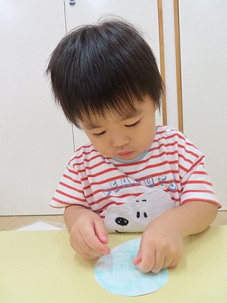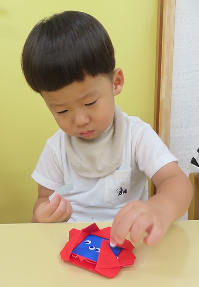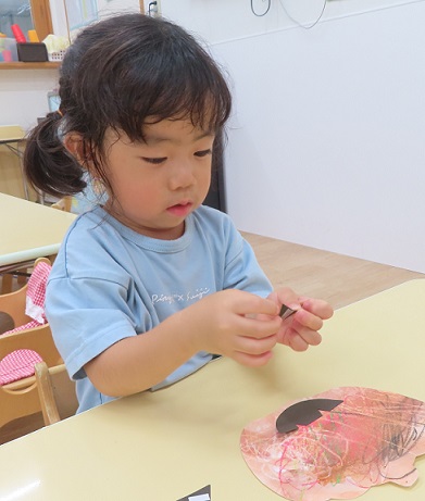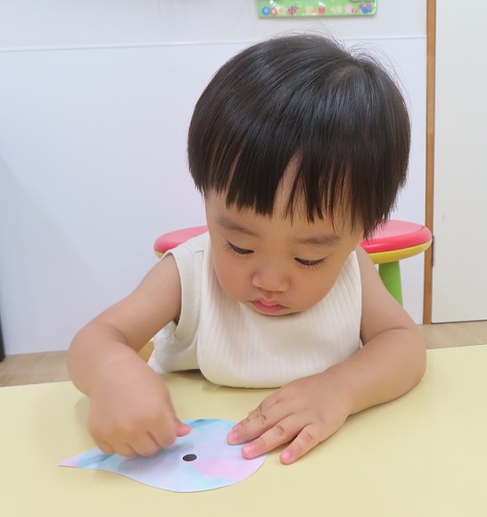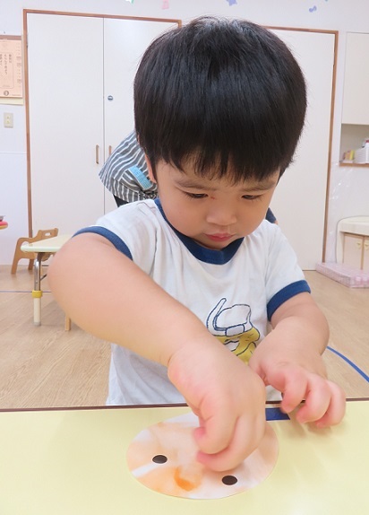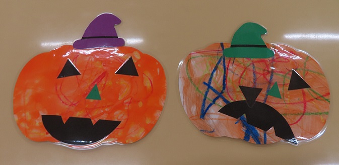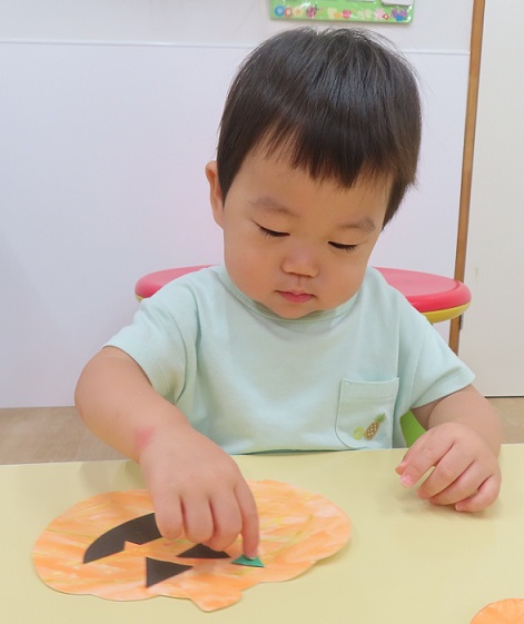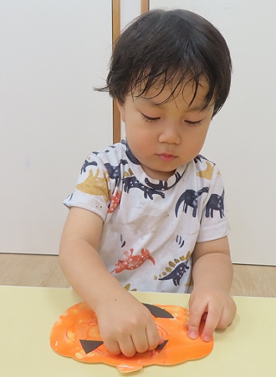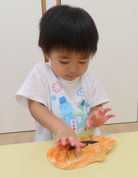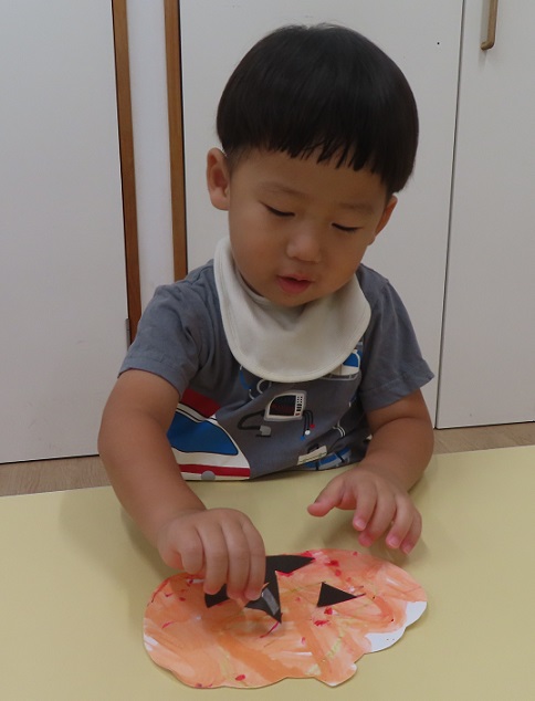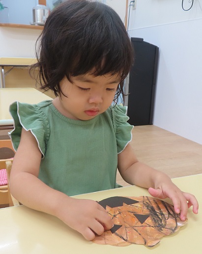 はじき絵をかぼちゃの形に切り、ジャックオーランタンに変身!目や口のパーツを貼り付け、完成すると「かぼちゃおばけだ~っ👻✨」と言って喜んでいました😊色々な表情のジャックオーランタンができてとても可愛いです♪