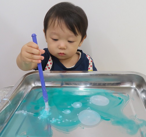 なにができるのかな?と不思議な表情をしながら洗濯糊を混ぜた水に絵の具を混ぜていく子どもたち👀