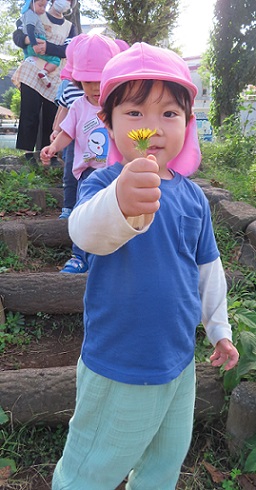 戸外に出ることをとても楽しみにしており、蟻やダンゴムシを探して友だちと見せ合ったり、草花を摘んで集めたりして楽しんでいました。公園内を元気に駆け回る姿もあり、一人ひとりのペースで遊びを楽しんでいました。