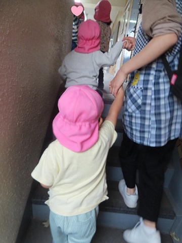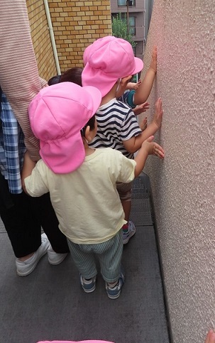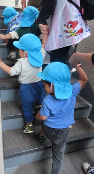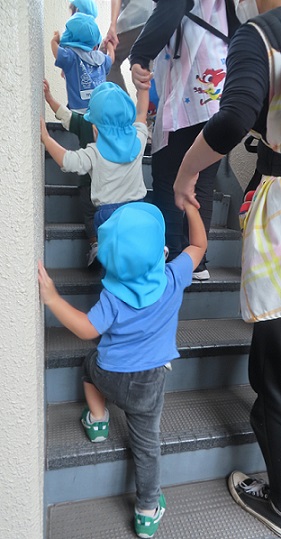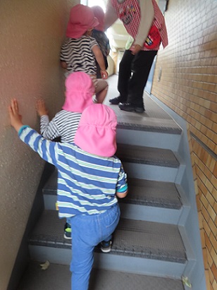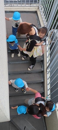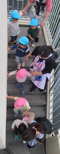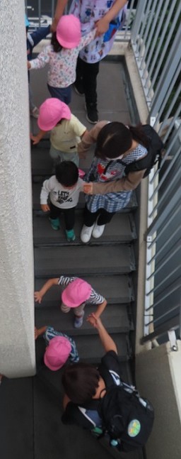 水害の避難訓練では、マンションの上階まで避難しました。「よいしょ、よいしょ」と言いながら頑張ってたくさんの階段を上り、無事に全員避難することが出来ました!
