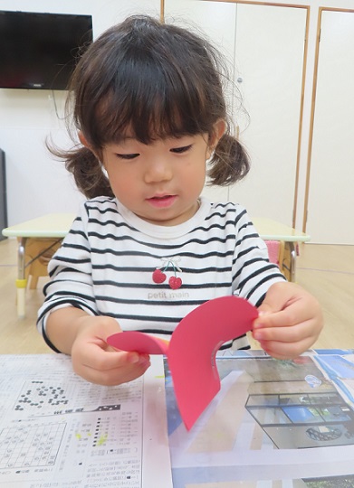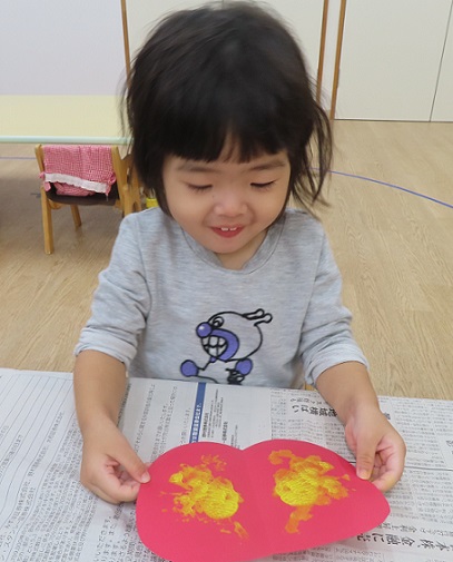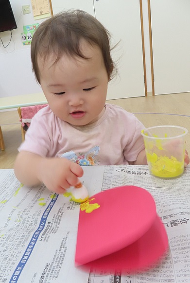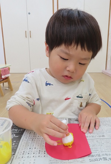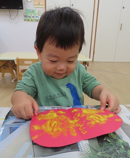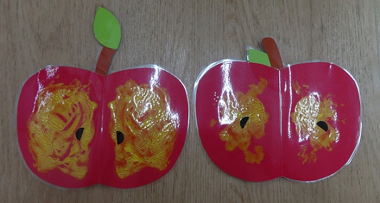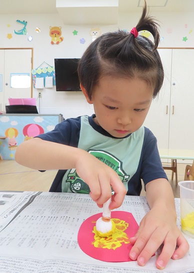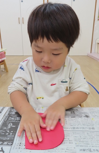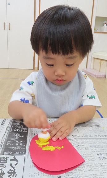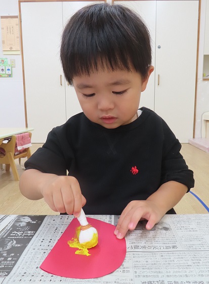 デカルコマニー(合わせ絵)という技法で、りんごの製作をしました。「ここに、ポンポンしてね」という説明をしっかりと聞き、丁寧にポンポンを色を付けていました!