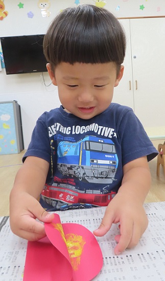 しっかり色が移ったかな?ドキドキしながらゆっくりを画用紙を開く子どもたち。