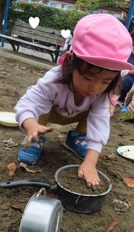 秋の公園では、昆虫や植物を探したり、友だちと追いかけっこをしたりと楽しんでいる子どもたち。「だんごむし、いたよ!」と見つけたものを保育者にもよく見せてくれます!