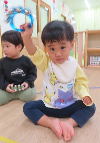 講師の先生の見本をよく見て、自分たちでも楽器を鳴らしています♪ピアノの音に合わせて鳴らすことも徐々に上手になってきました!