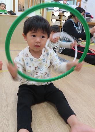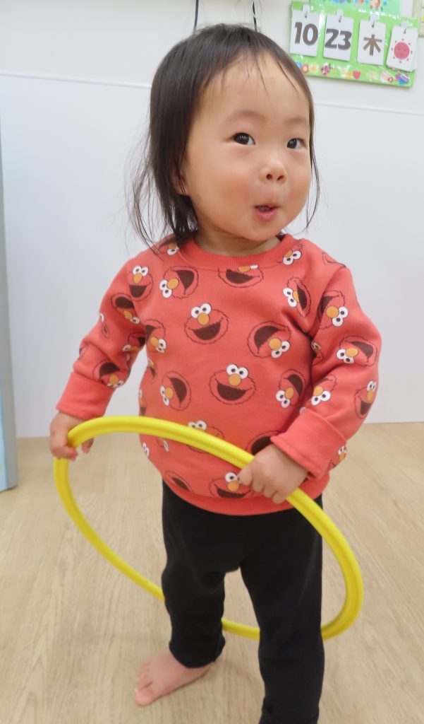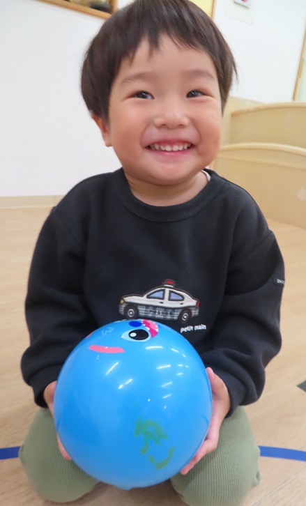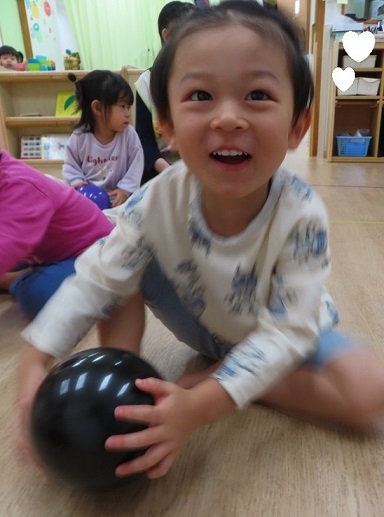 両手でしっかりとボールを持って、音に合わせてトントンと上手に床に叩いていました。