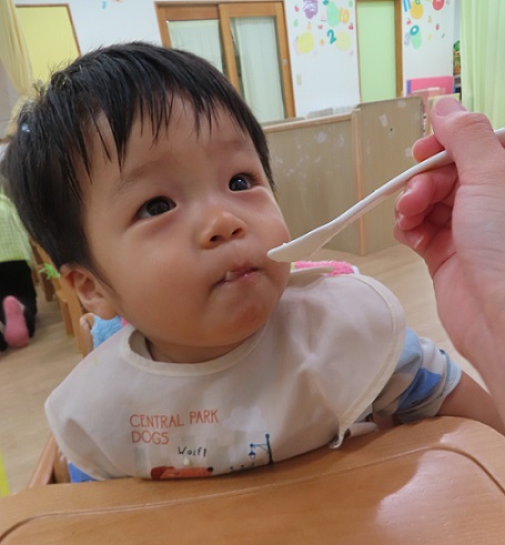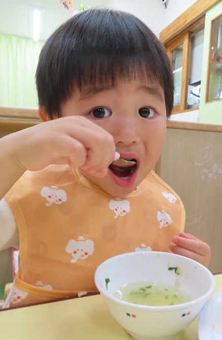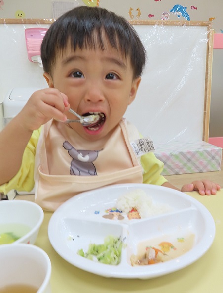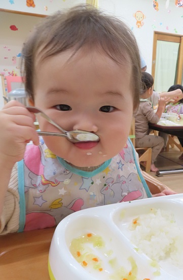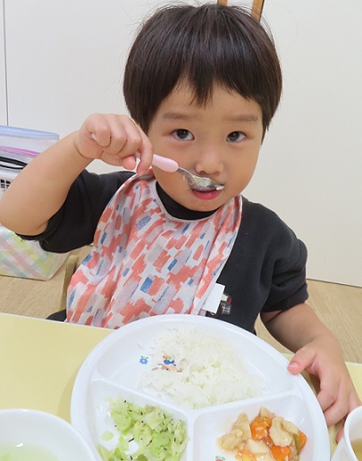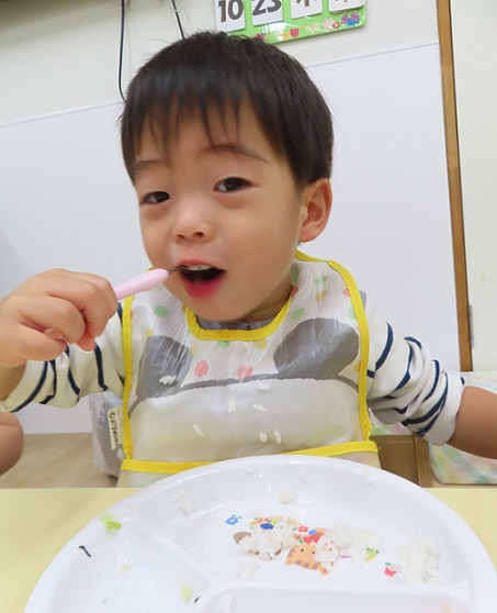 「おいしい!」という声がよく聞こえる給食の時間。自分で食具を持ち、大きな口でよく噛んで食べています!毎日、たくさんおかわりしています!