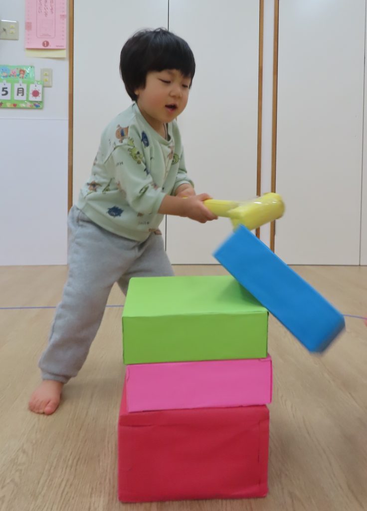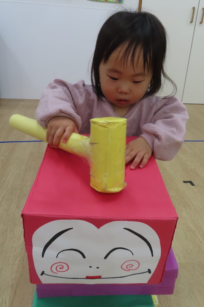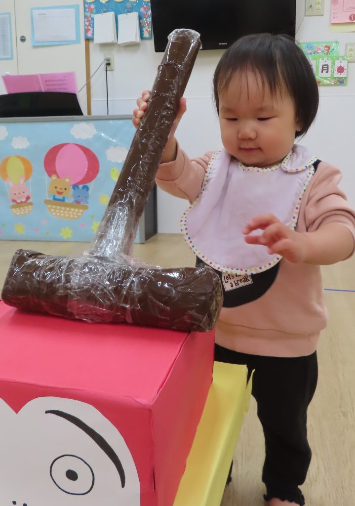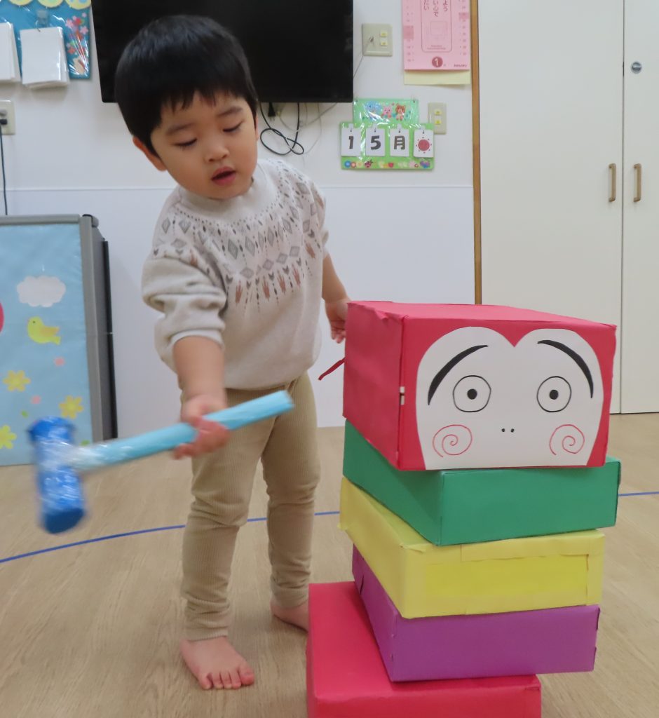 ぞう組さんは、保育者の見本のように頭を落とさずに遊びたかったようで、だるまの頭を押さえながらハンマーで体の部分を叩いている子が多かったです😂