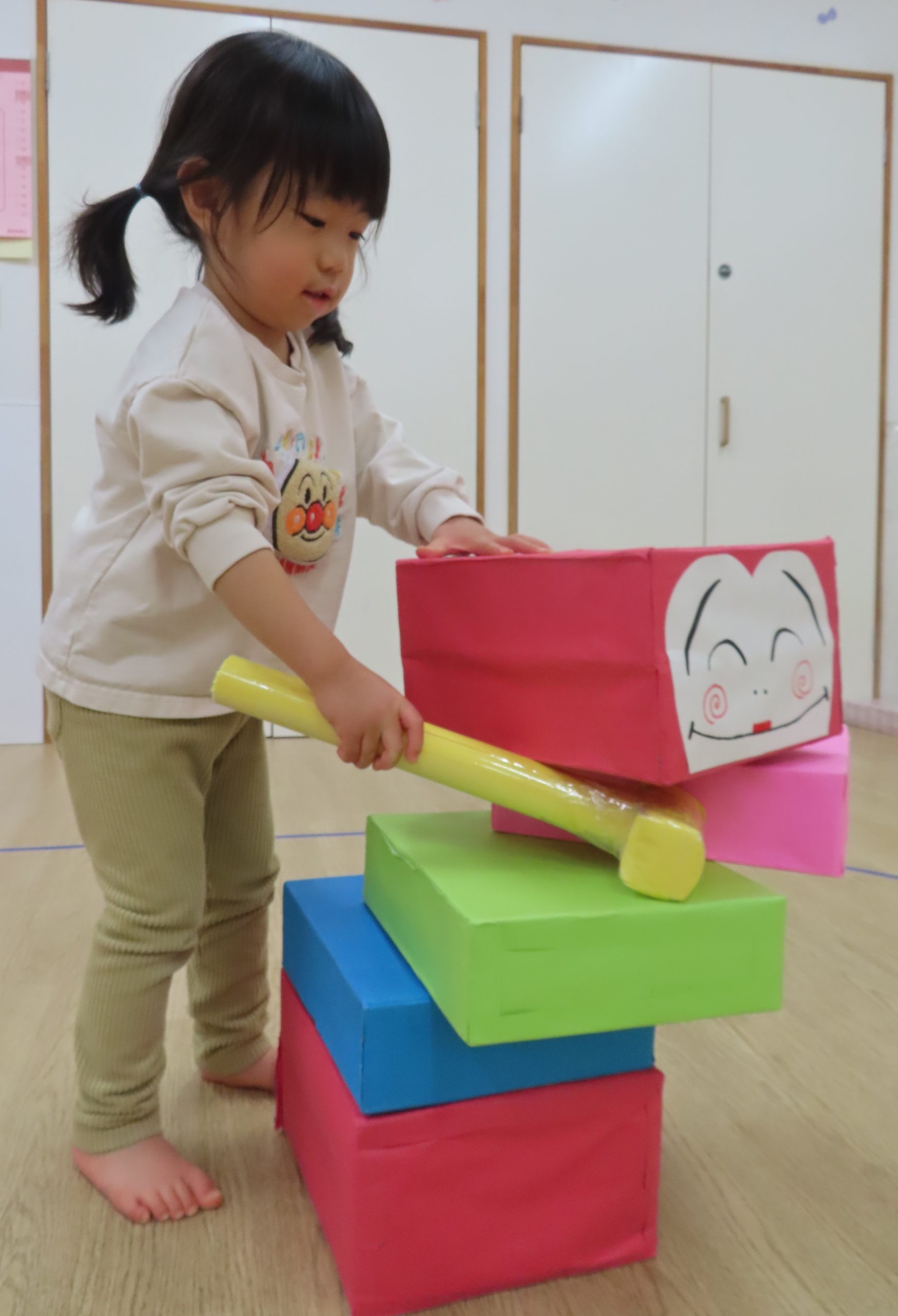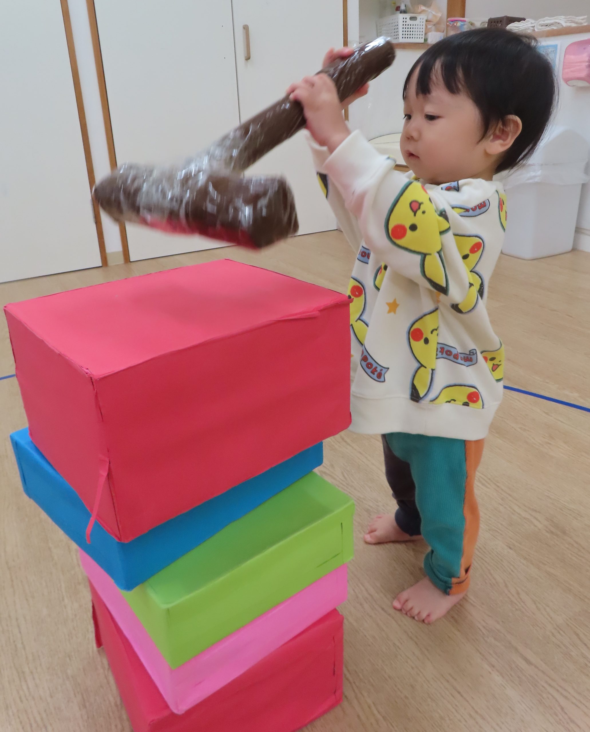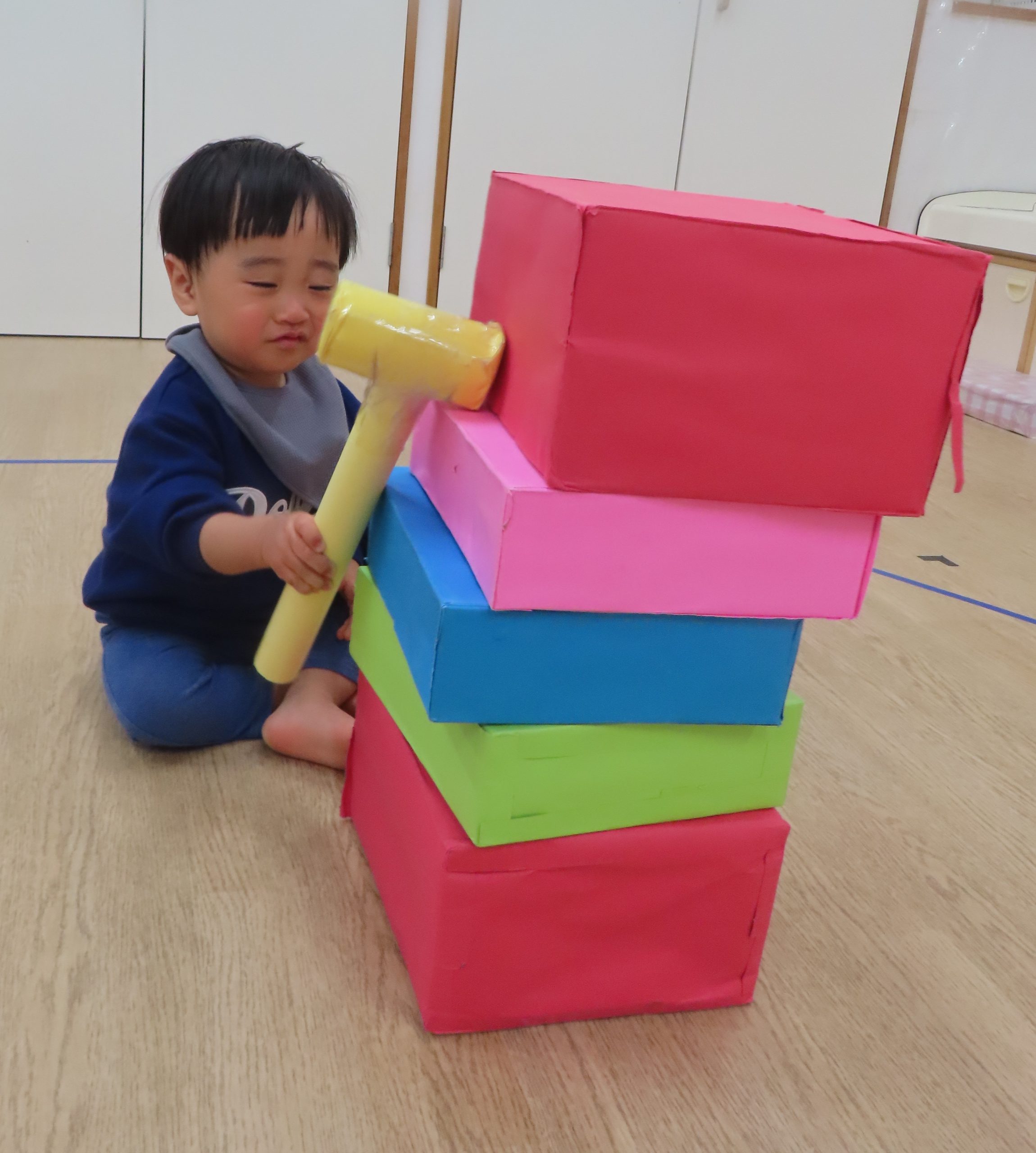 ぞう組さんは、保育者の見本のように頭を落とさずに遊びたかったようで、だるまの頭を押さえながらハンマーで体の部分を叩いている子が多かったです😂