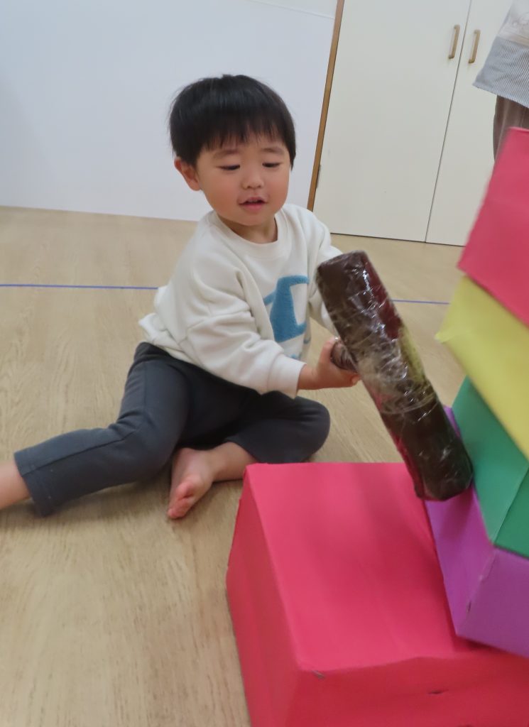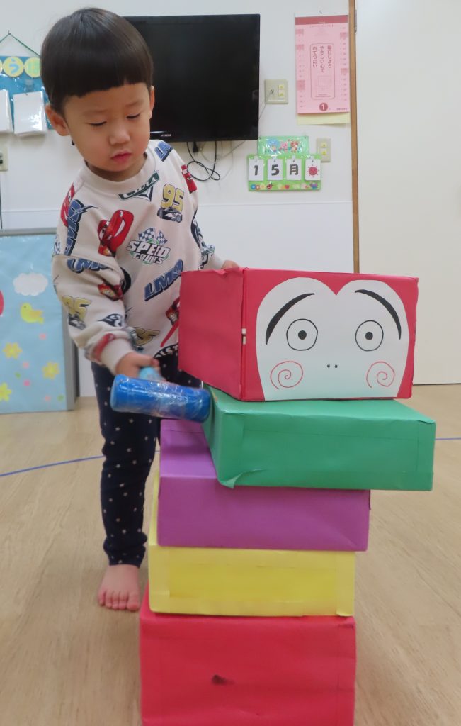 倒れただるまを保育者が直そうとすると積み重ねるお手伝いをしてくれる子もいて、一人ひとりの様々な楽しみ方がありました。