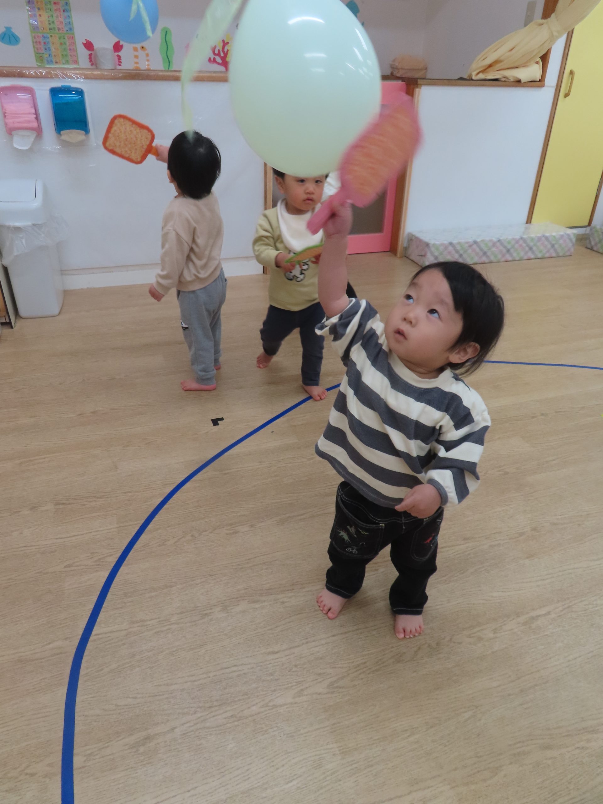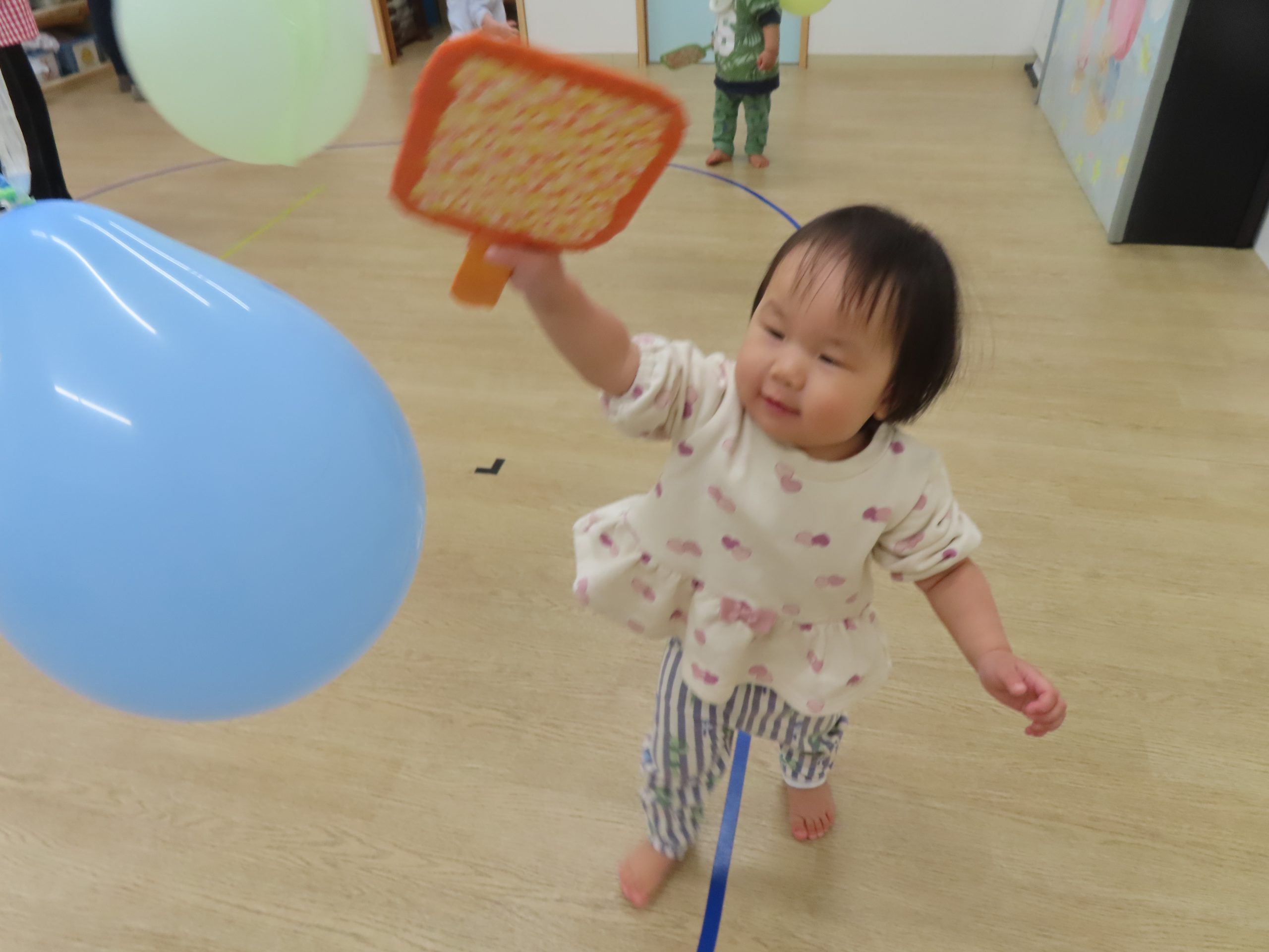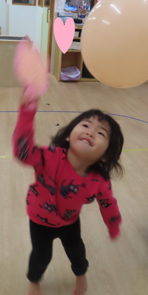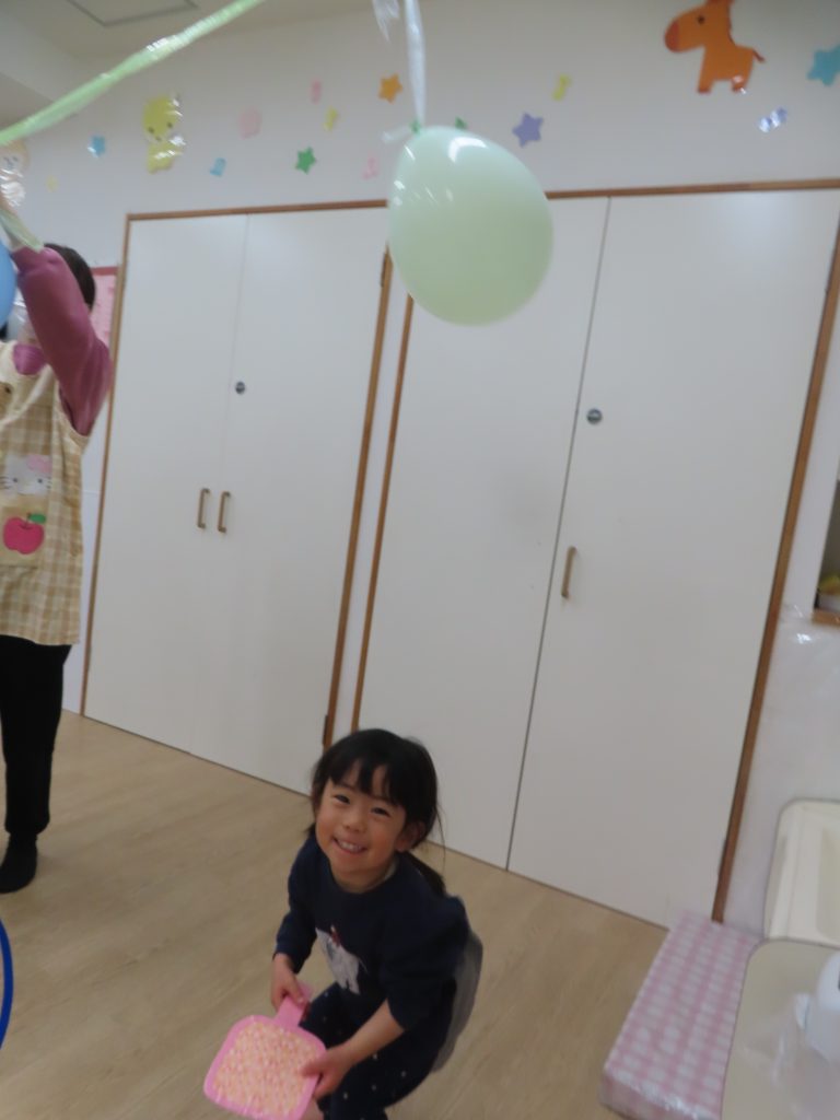 大好きな風船がたくさんぶら下がっていたので、夢中で叩いていた子どもたち。羽子板だけでなく、手や頭で風船に立ち向かう子もいて可愛らしかったです🎈