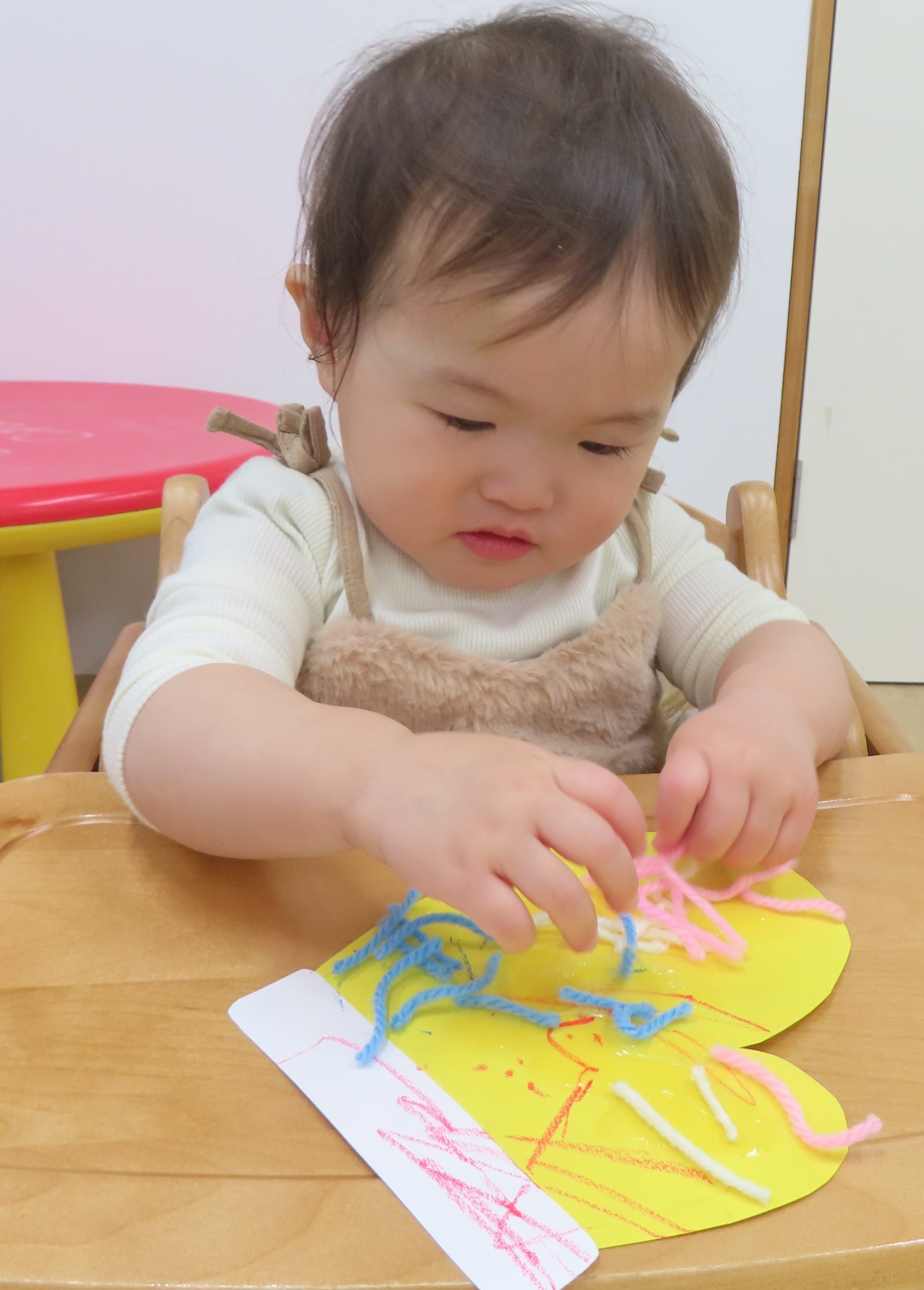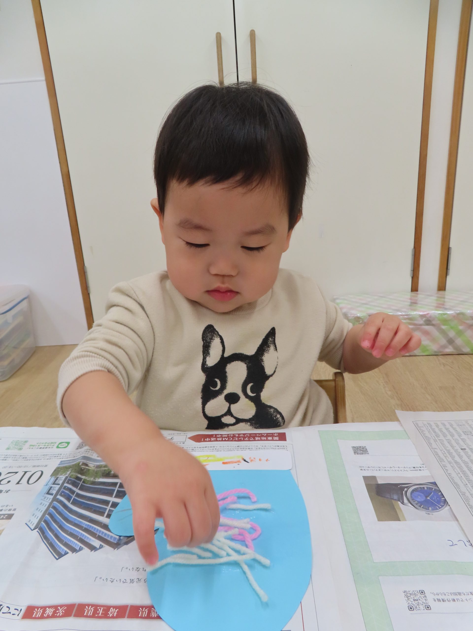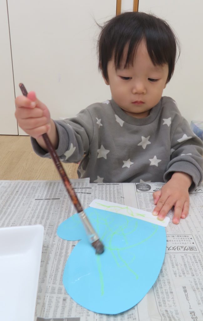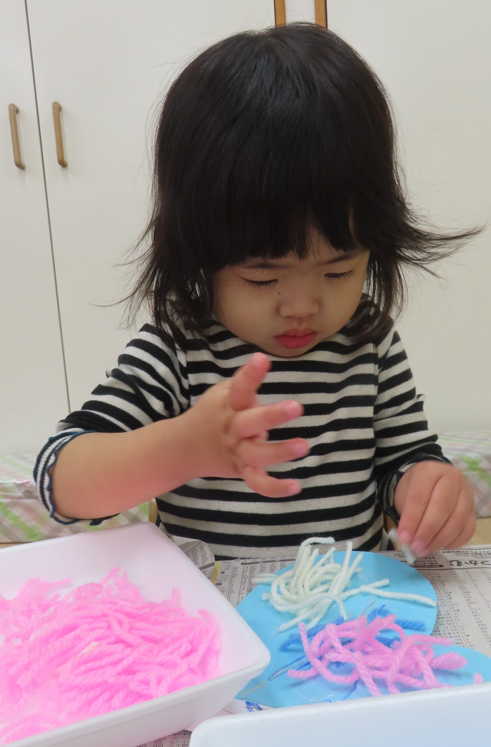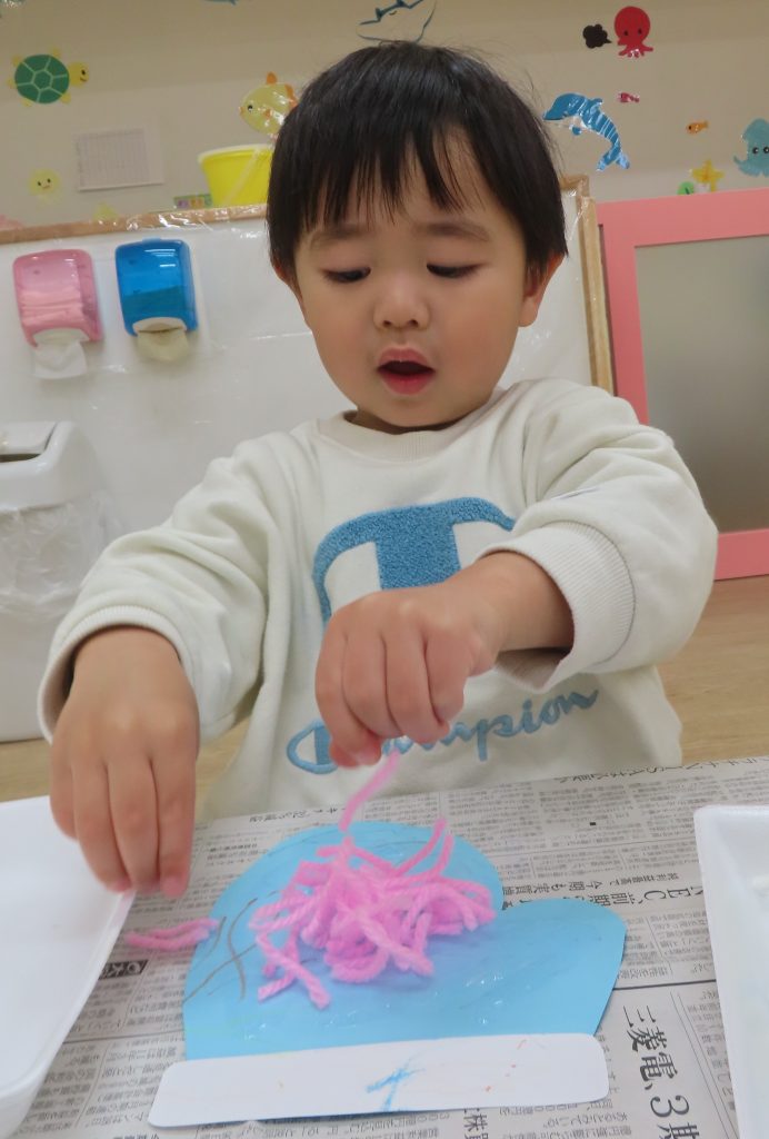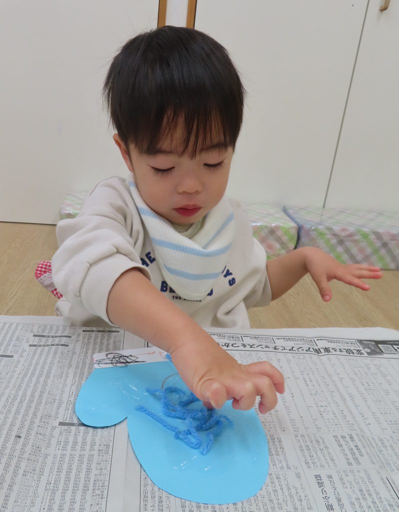 毛糸をパラパラ。手に糊が付かないように慎重に付けていました😂