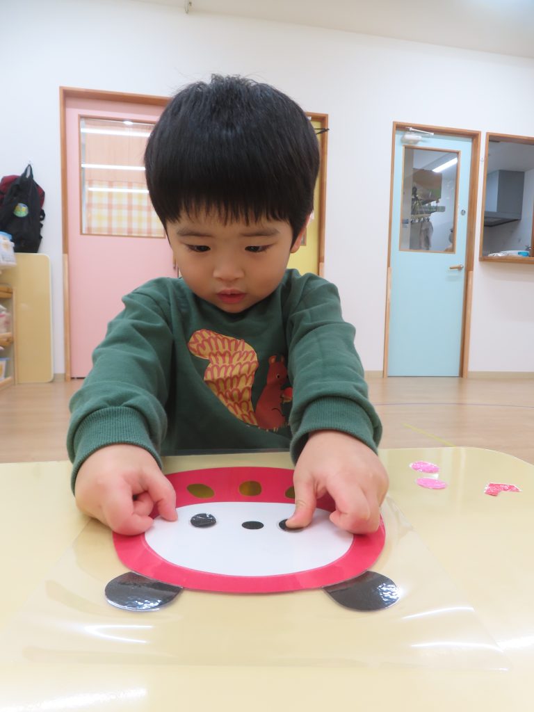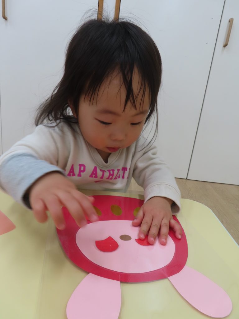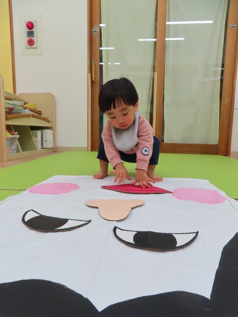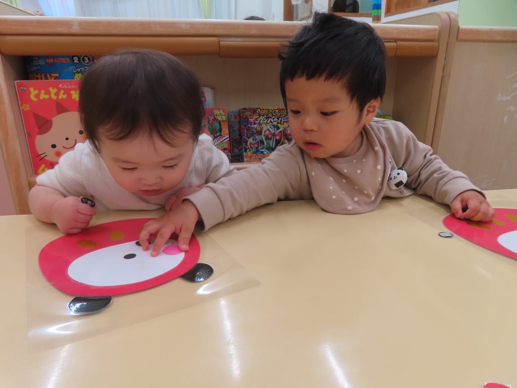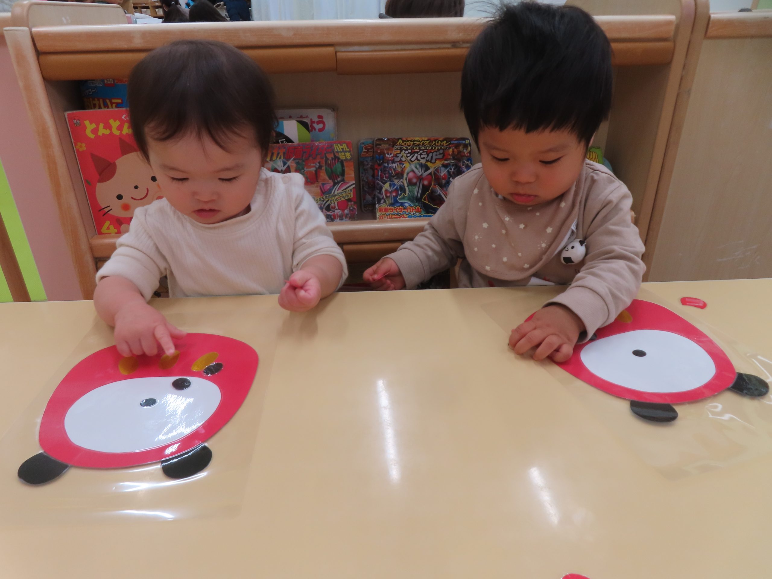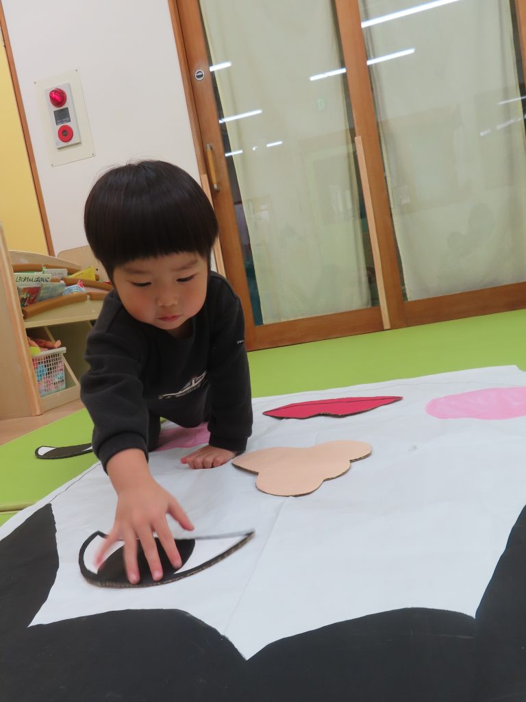 ひよこ組さんの3人が集中して遊んでくれたので驚きました!自分のところに友だちがパーツを貼っても怒ることなく、夢中で見ていました😊