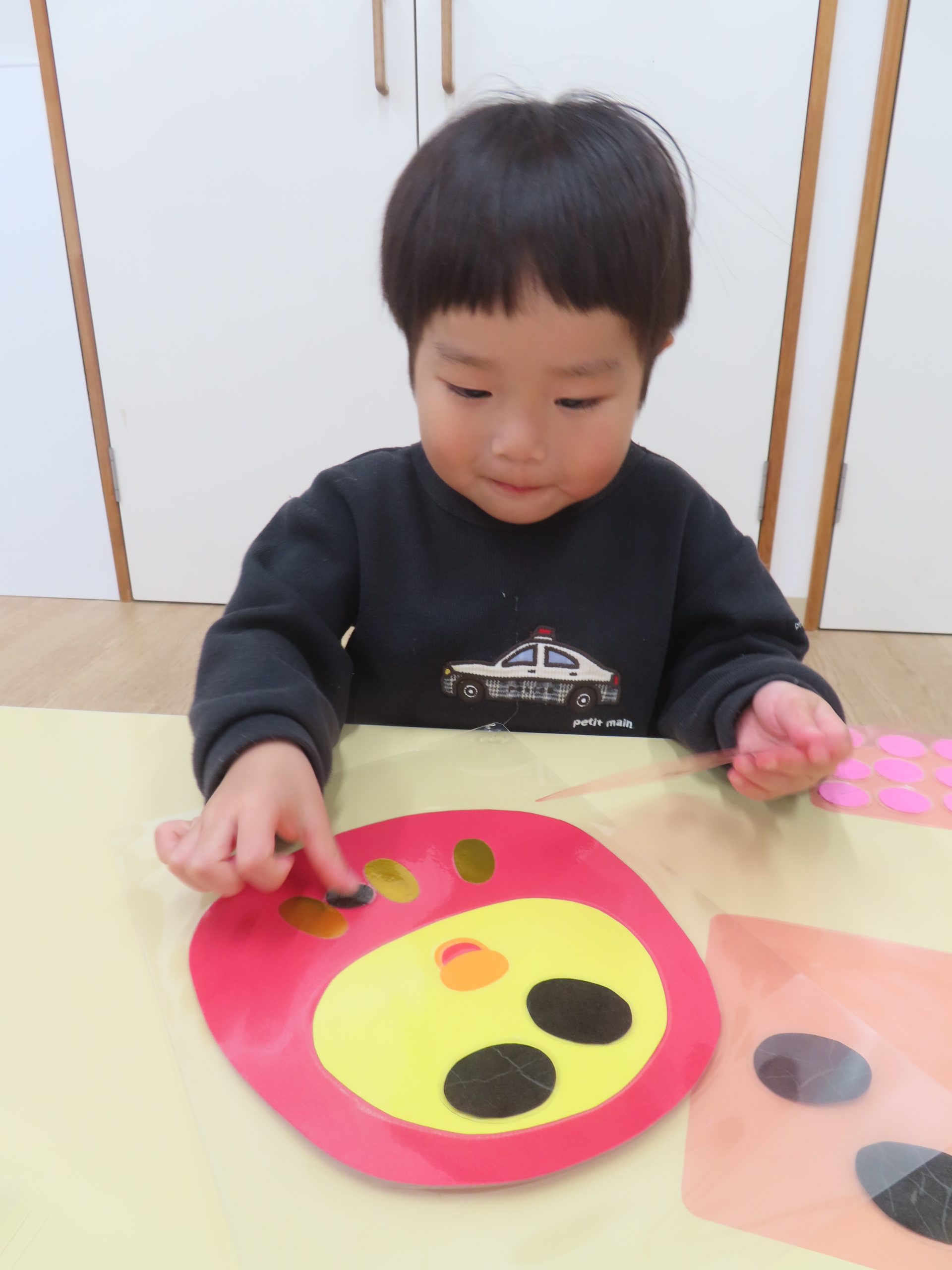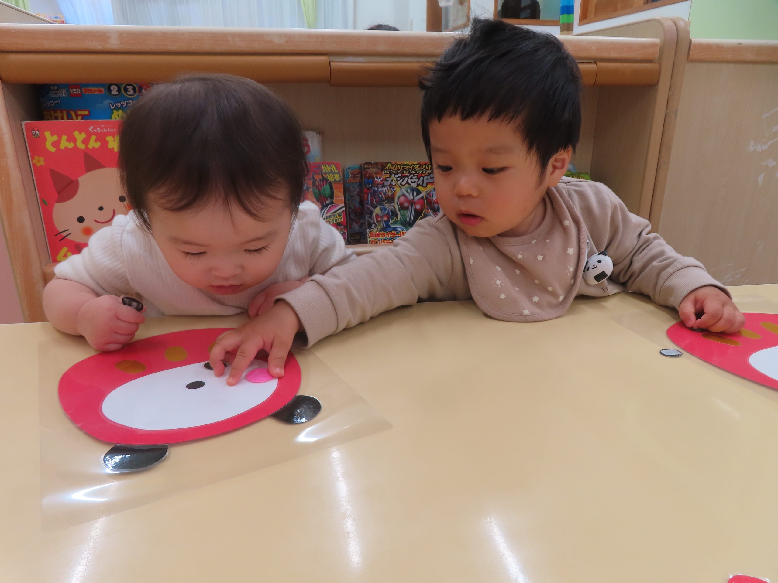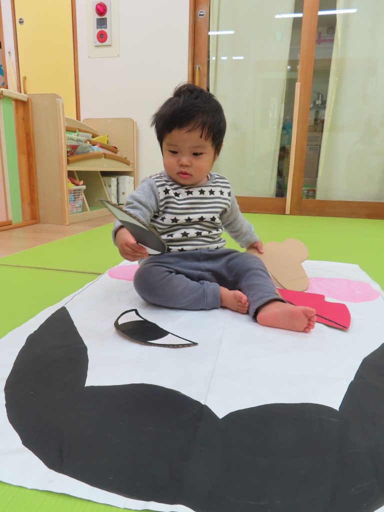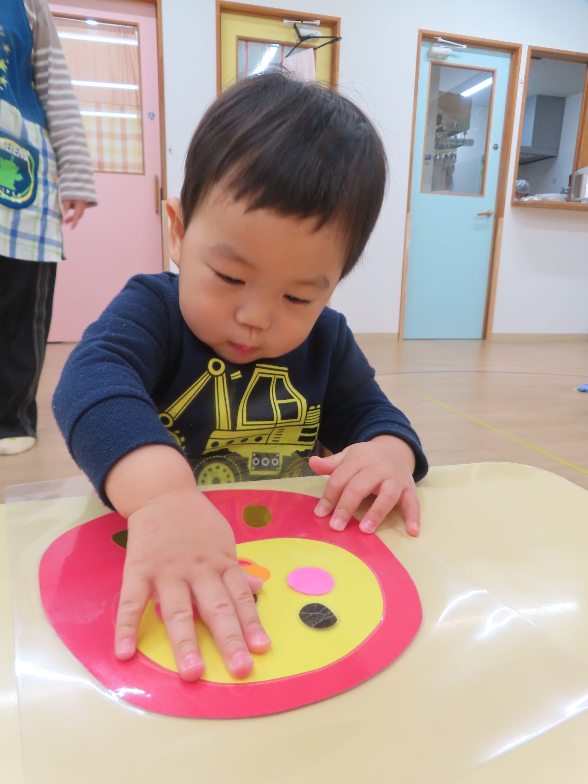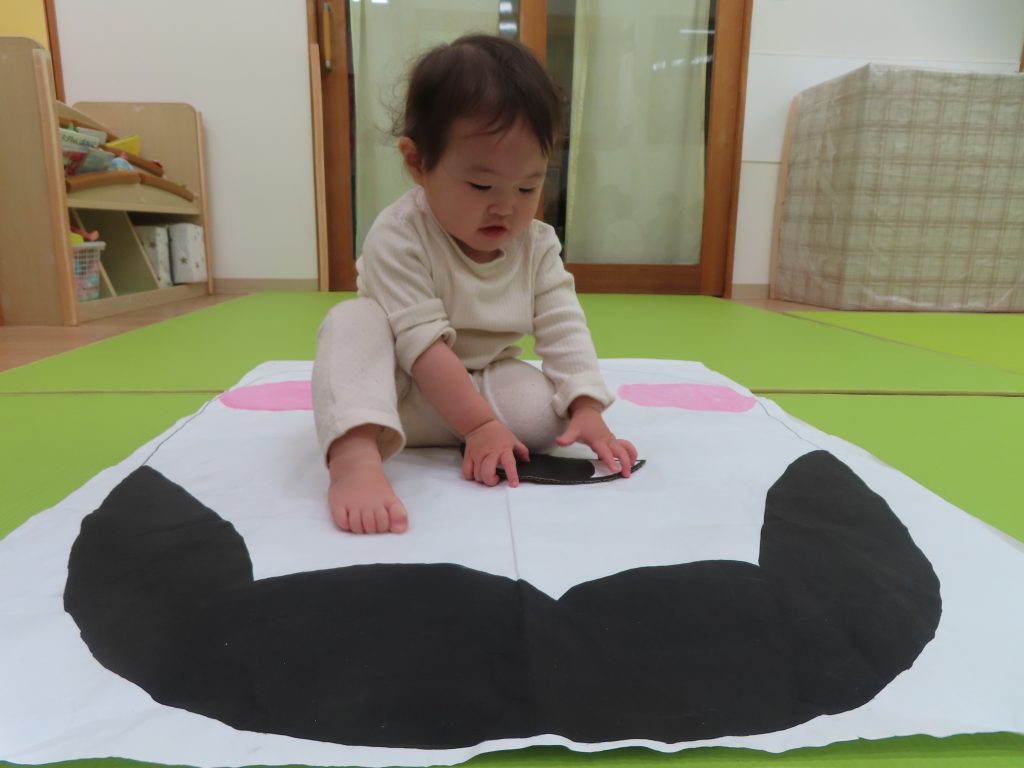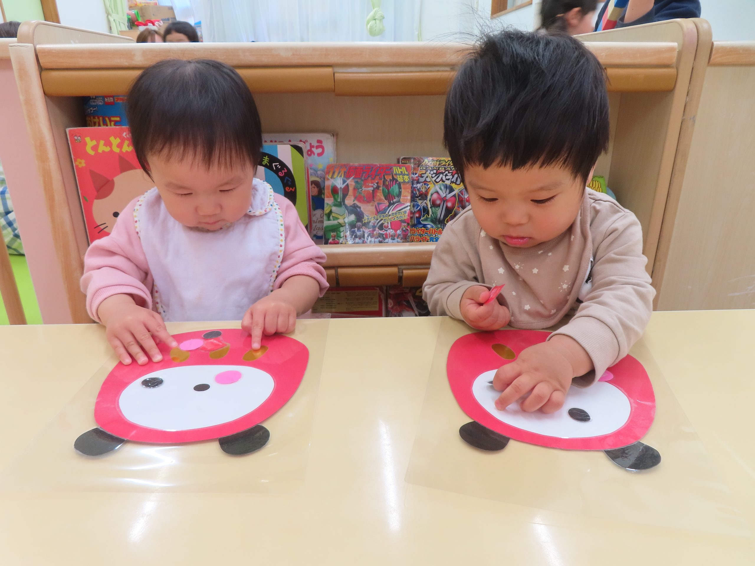 ひよこ組さんの3人が集中して遊んでくれたので驚きました!自分のところに友だちがパーツを貼っても怒ることなく、夢中で見ていました😊
