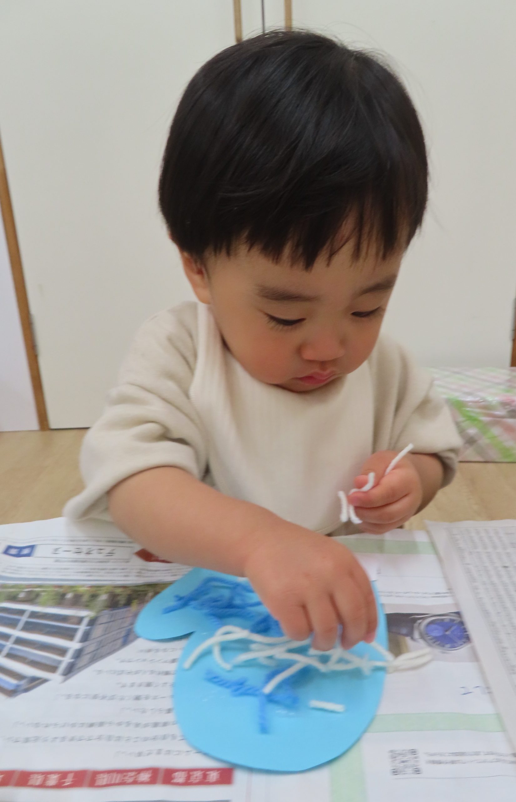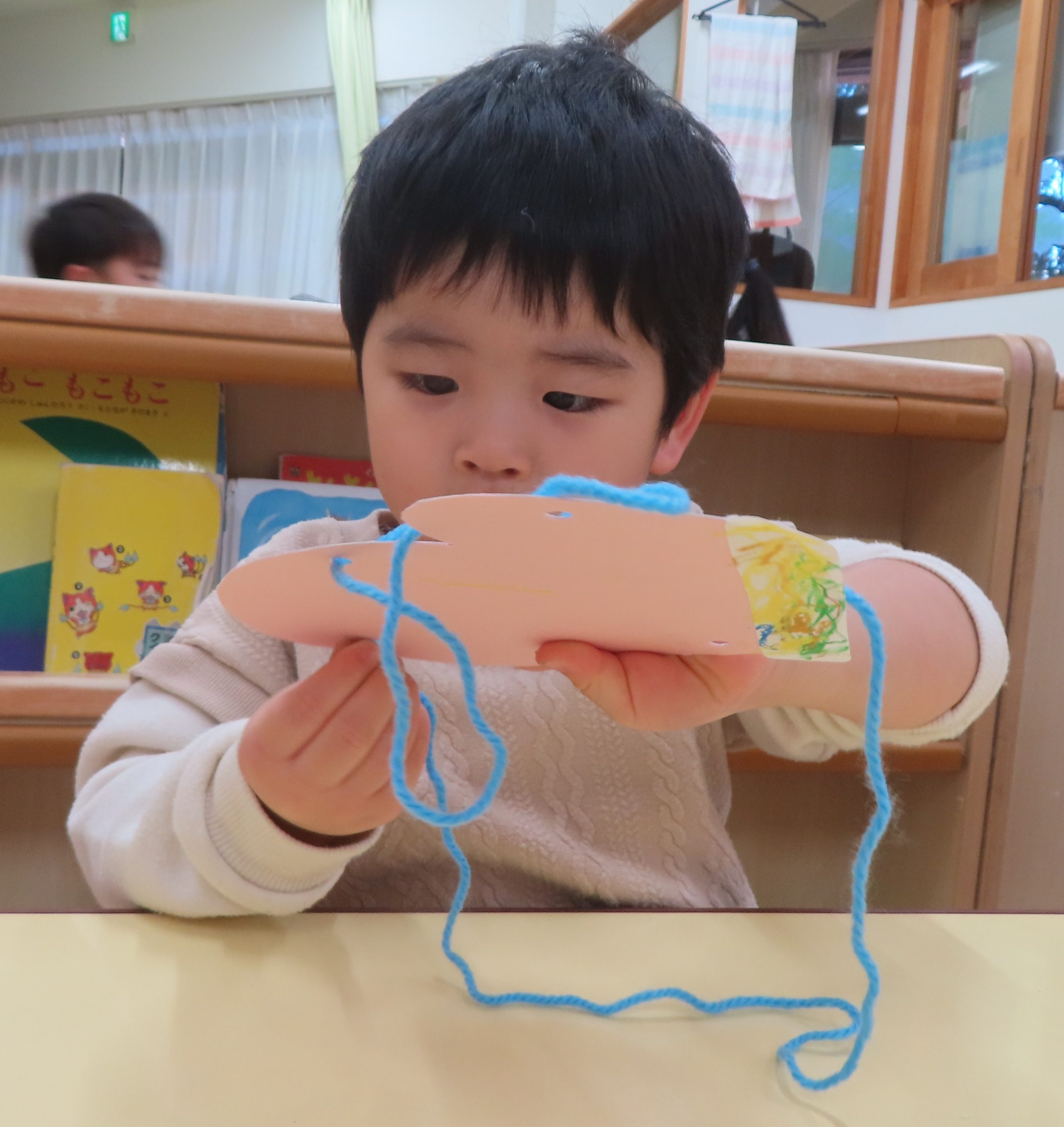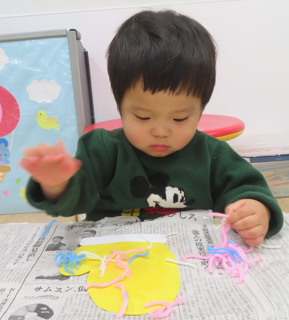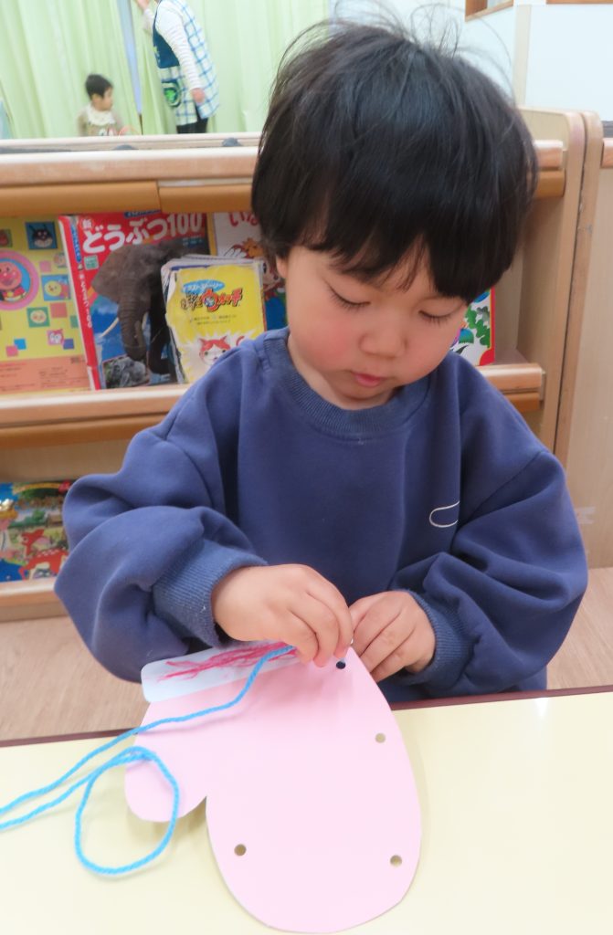 ぞう組は、紐通しを集中して行い、どの穴に通そうか悩んでいる子がいました。