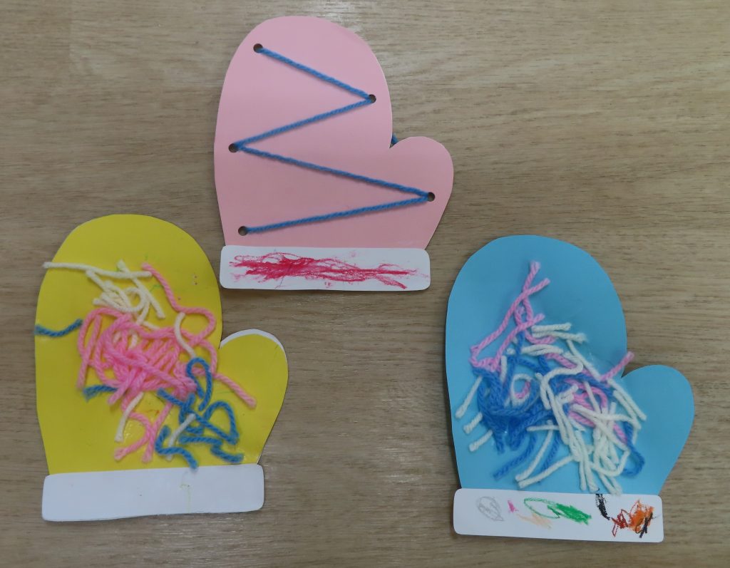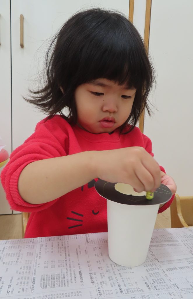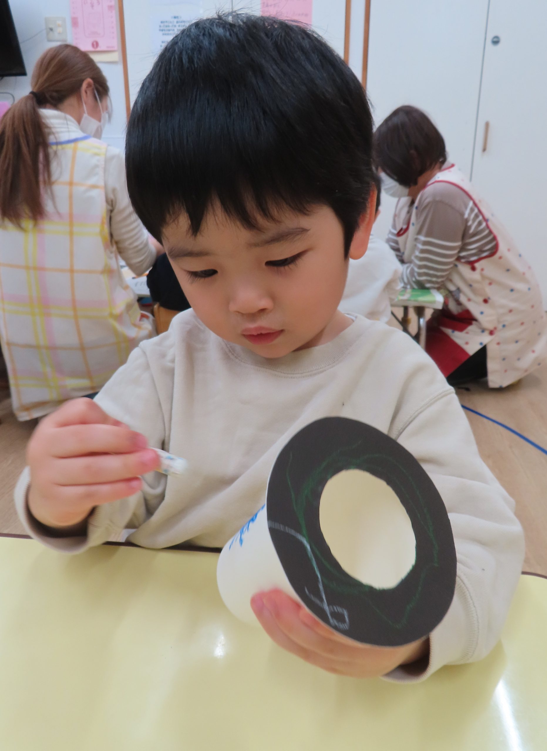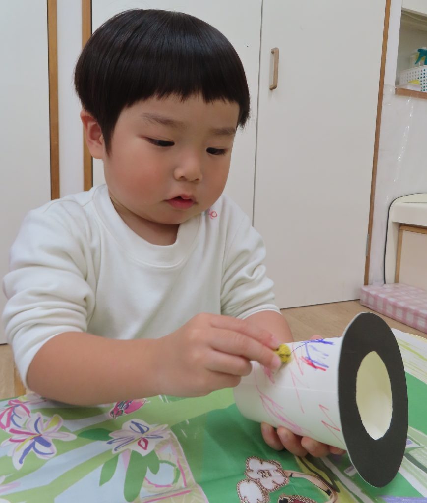 ぞう組は、紐通しを集中して行い、どの穴に通そうか悩んでいる子がいました。