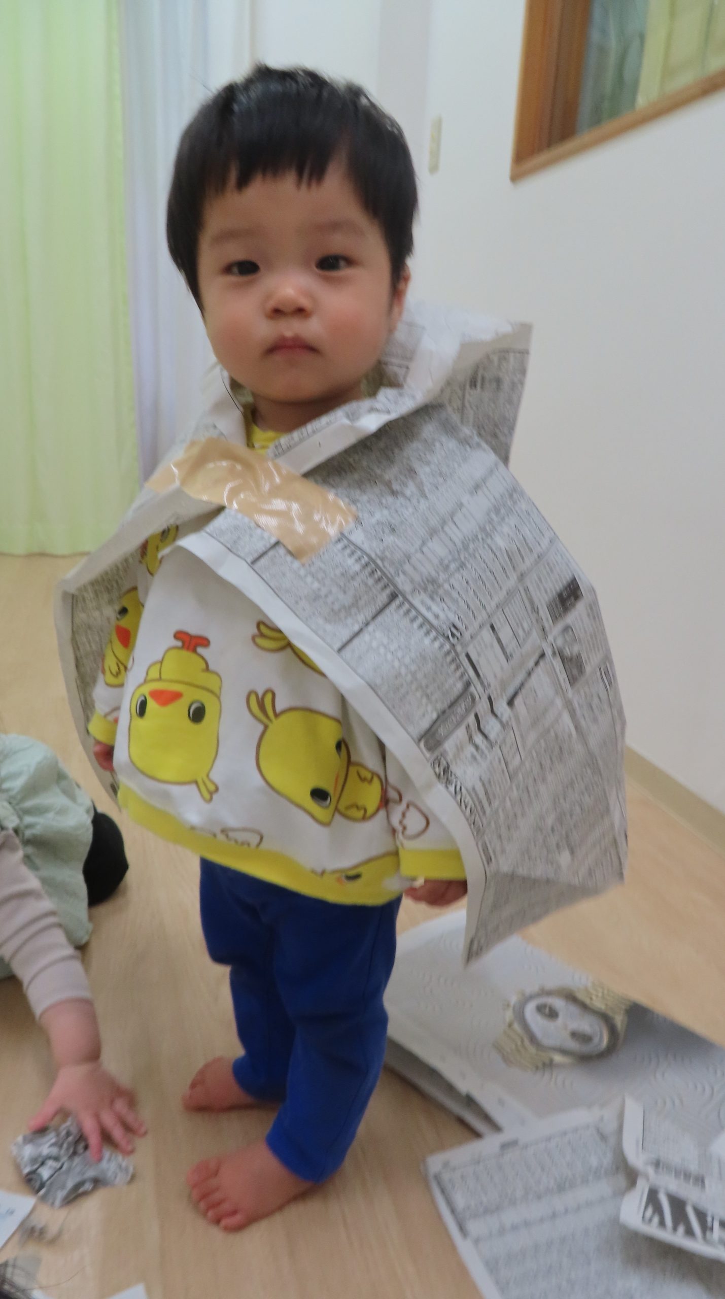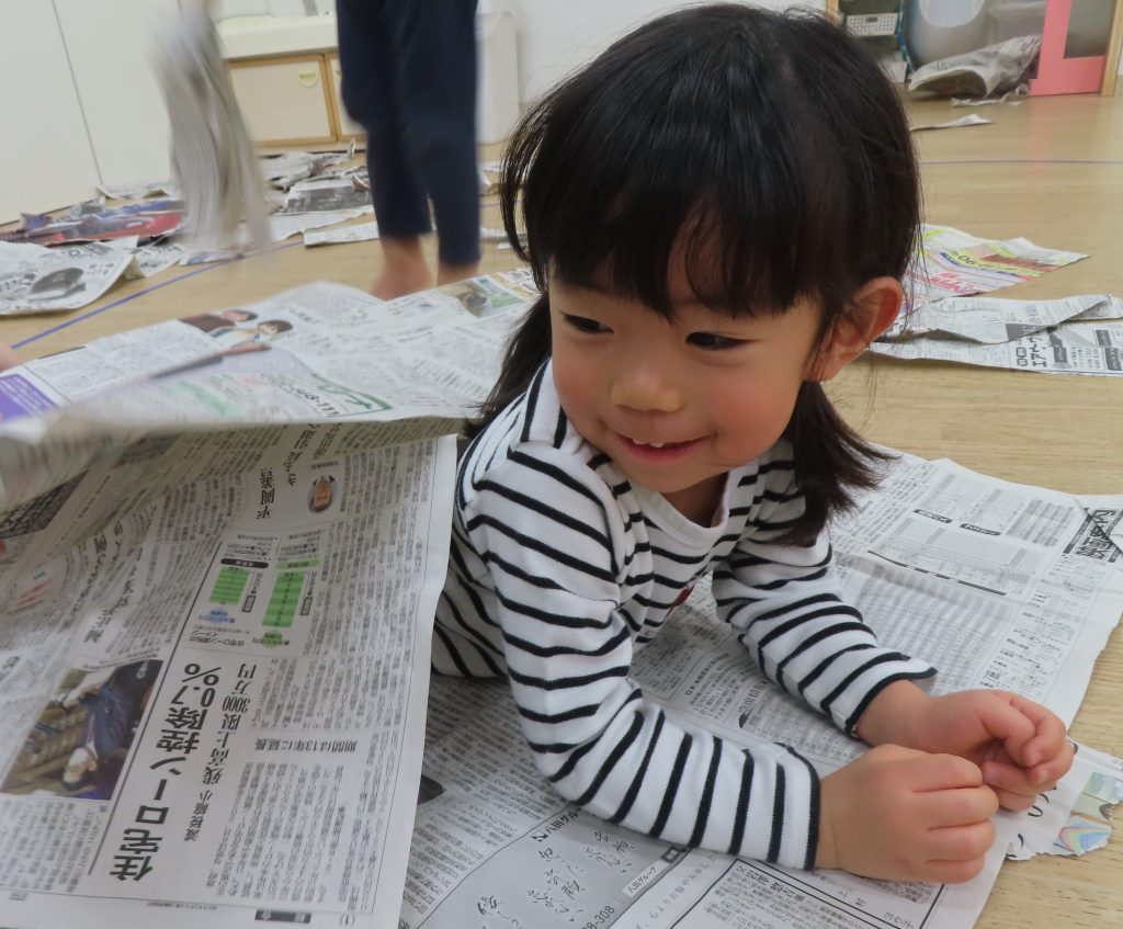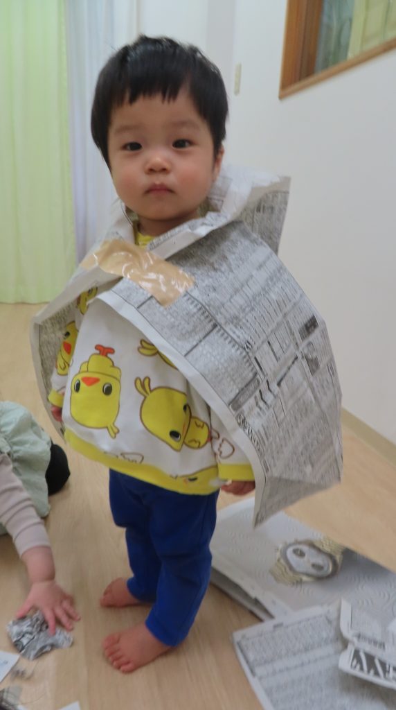 全身に新聞紙をまとい、笑顔で遊んでいた子どもたち。自分で体に新聞紙を巻き、“ガムテープを貼って”アピールをしていて可愛らしかったです。