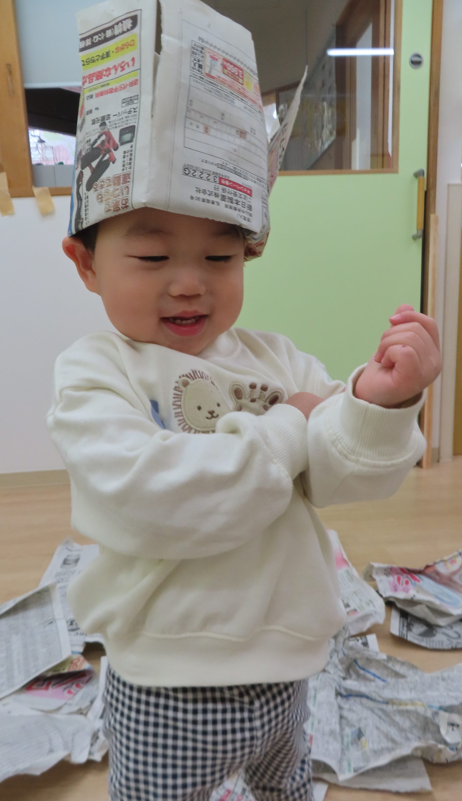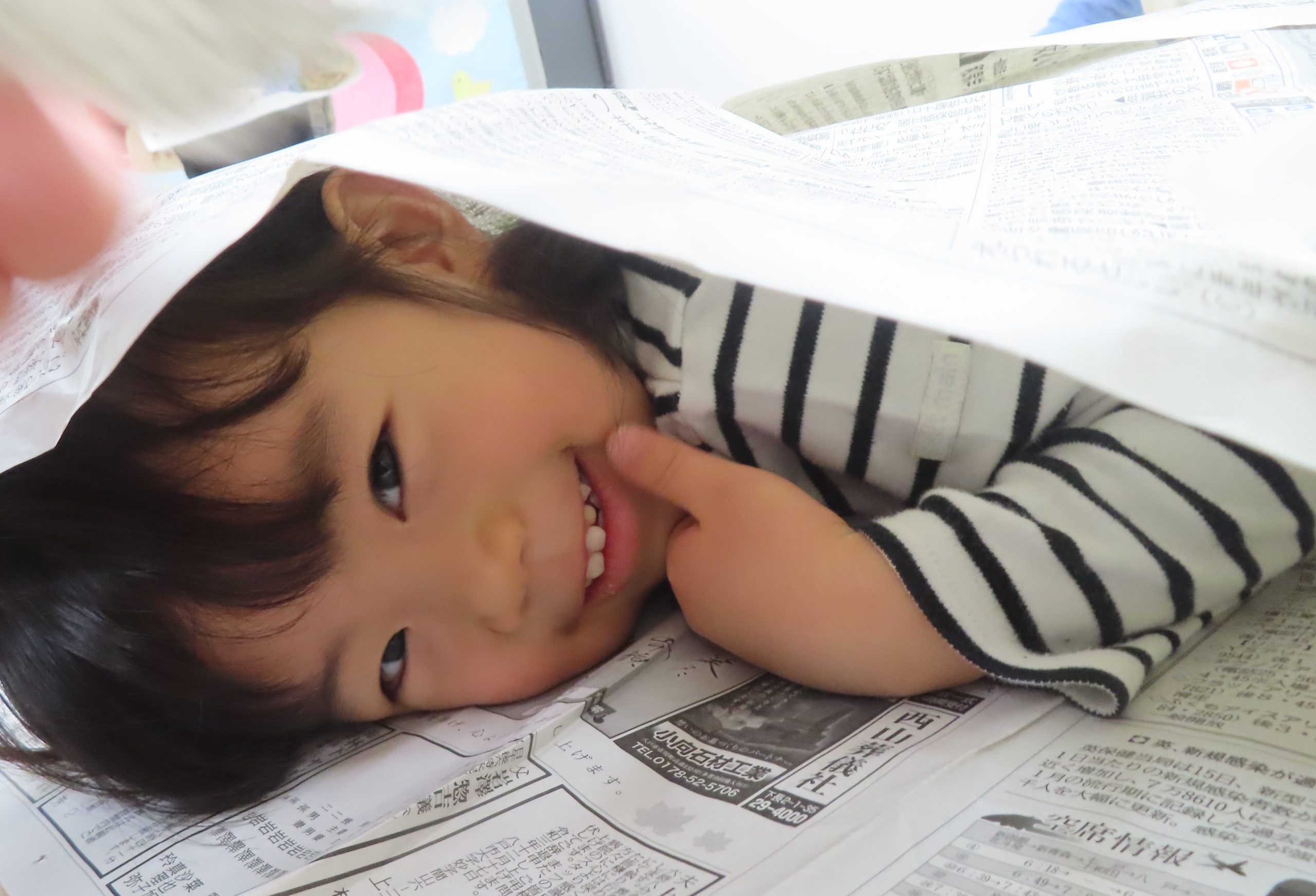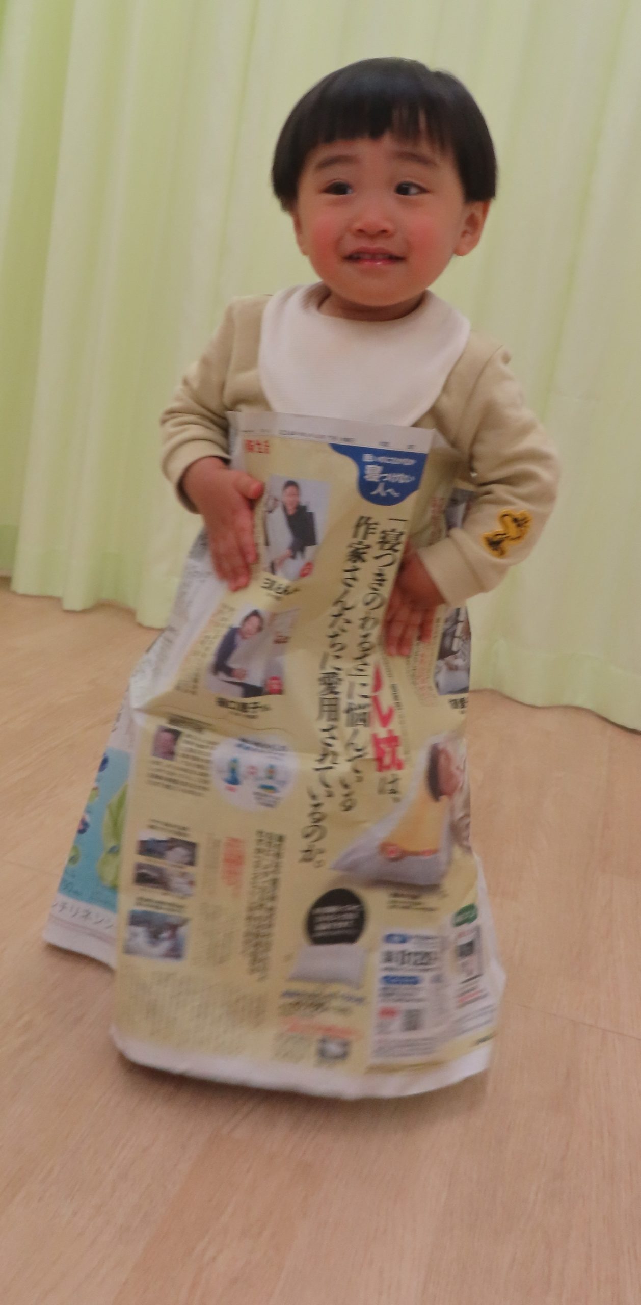 全身に新聞紙をまとい、笑顔で遊んでいた子どもたち。自分で体に新聞紙を巻き、“ガムテープを貼って”アピールをしていて可愛らしかったです。