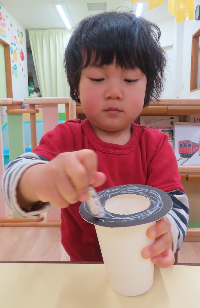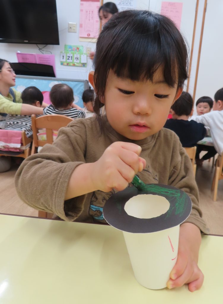 好きな色のクレヨンでコップに描き描き…🖍