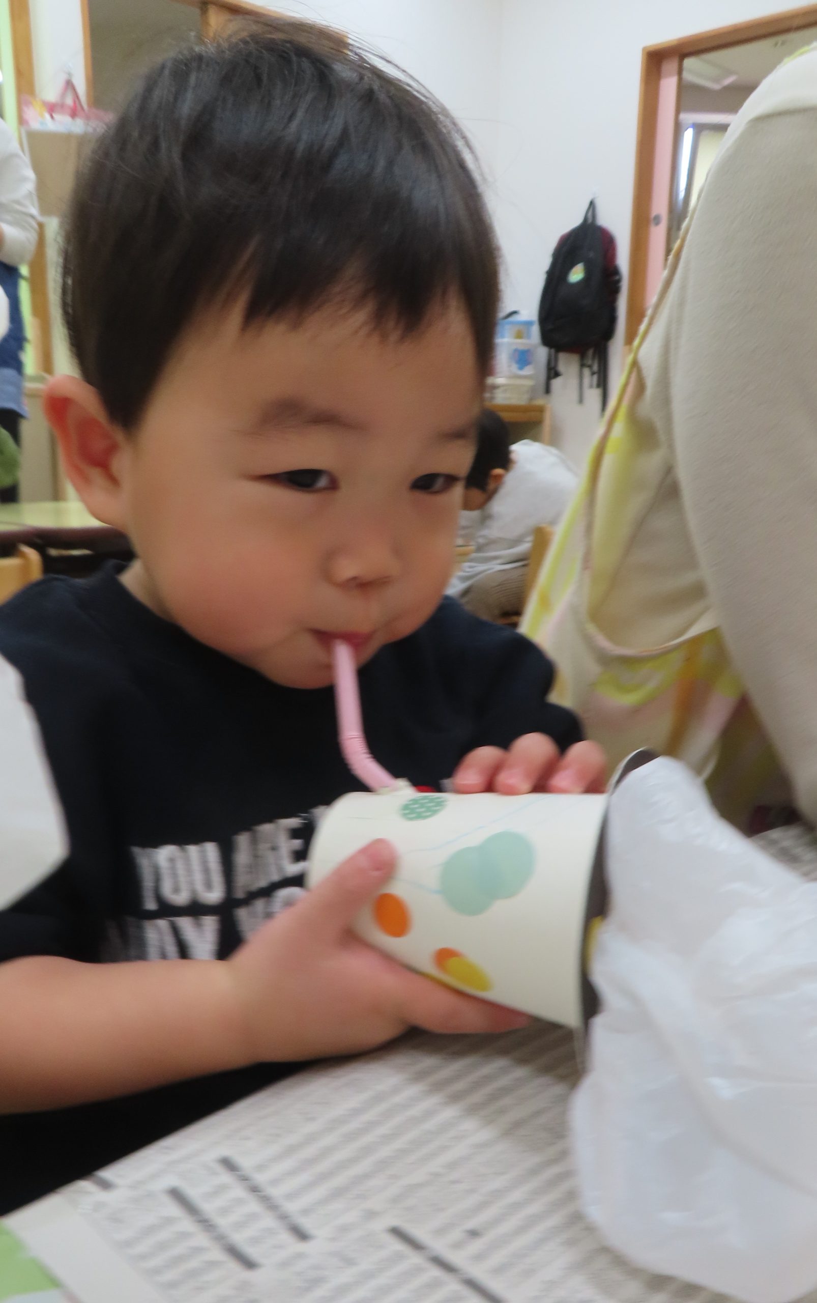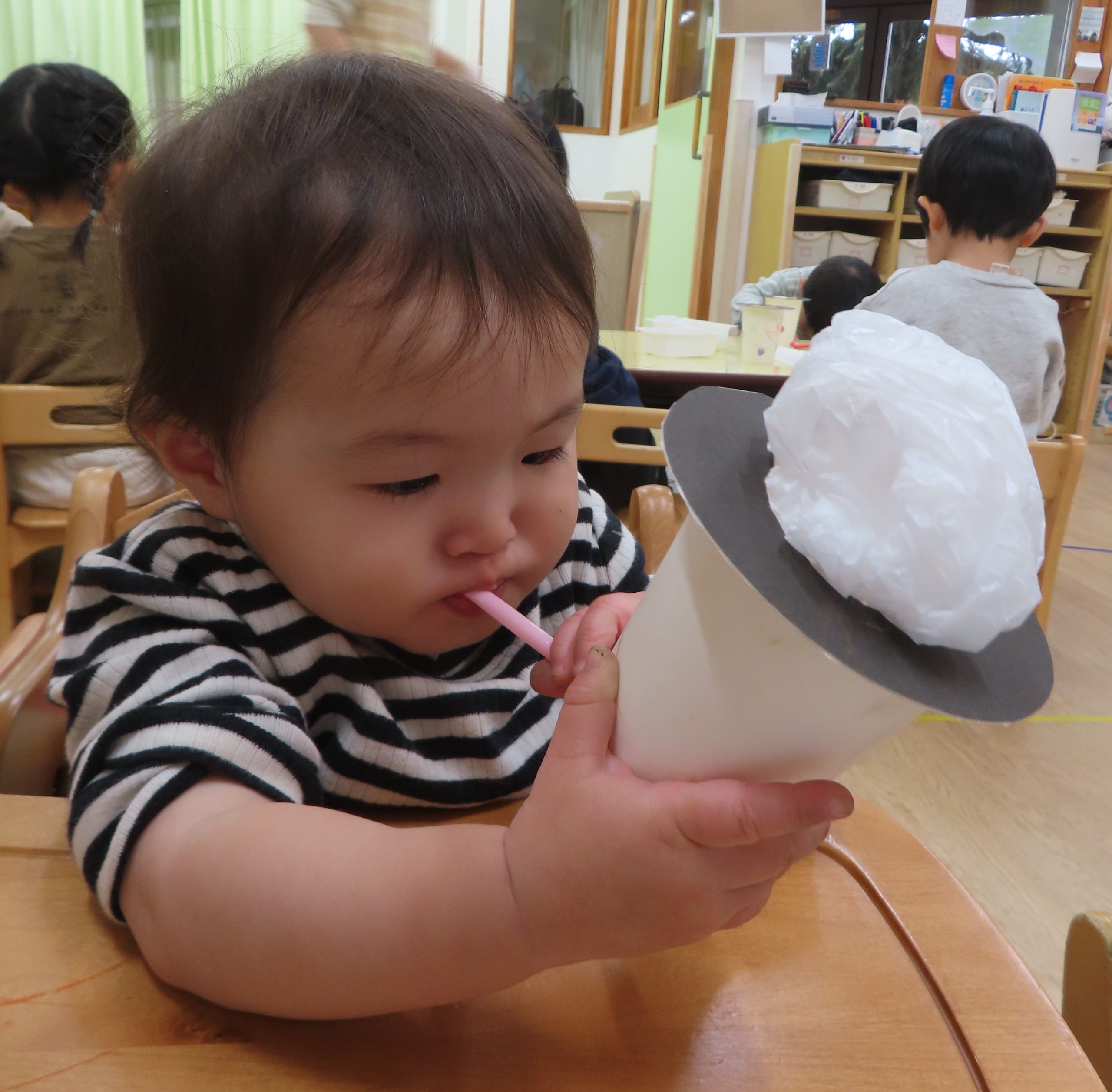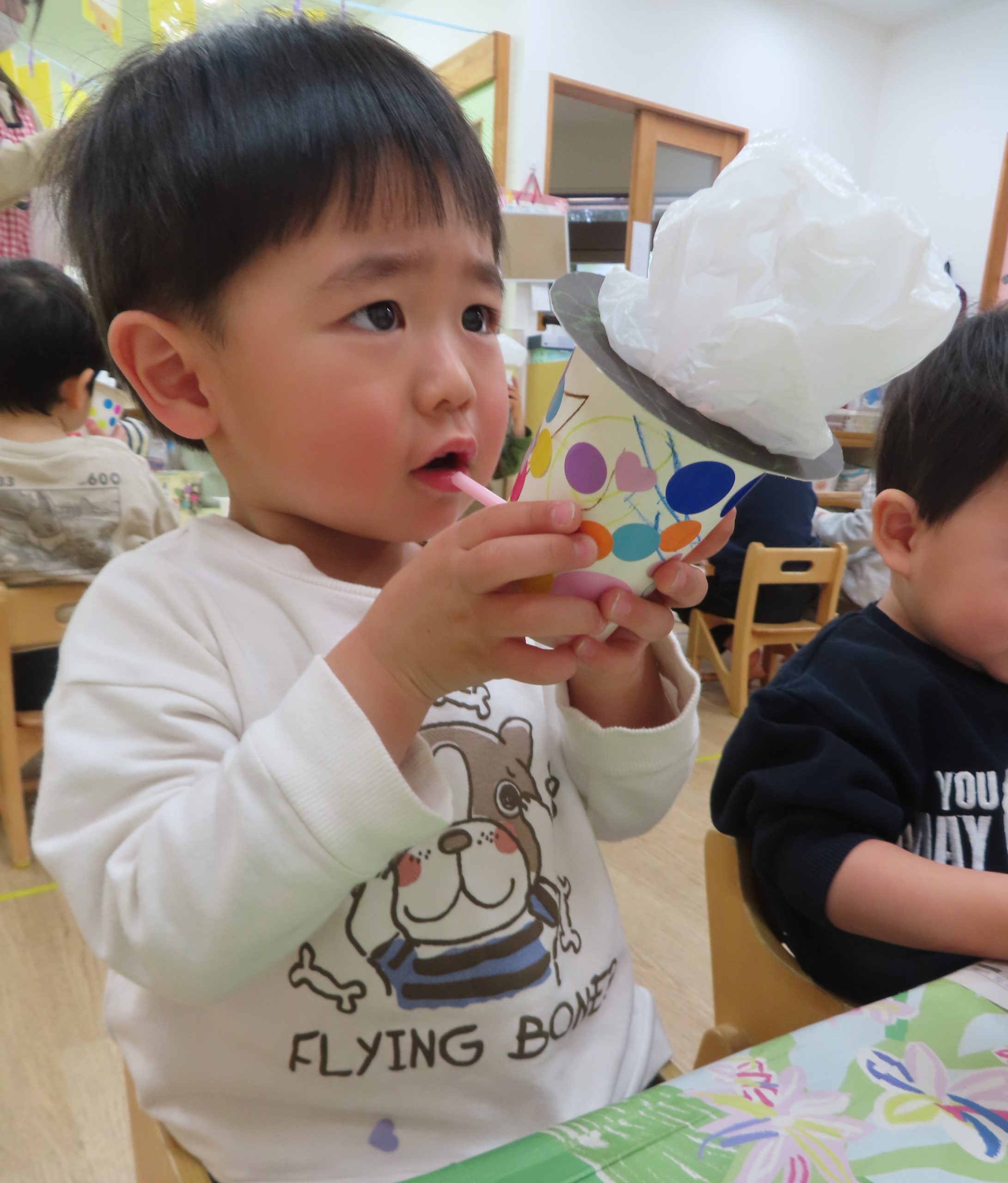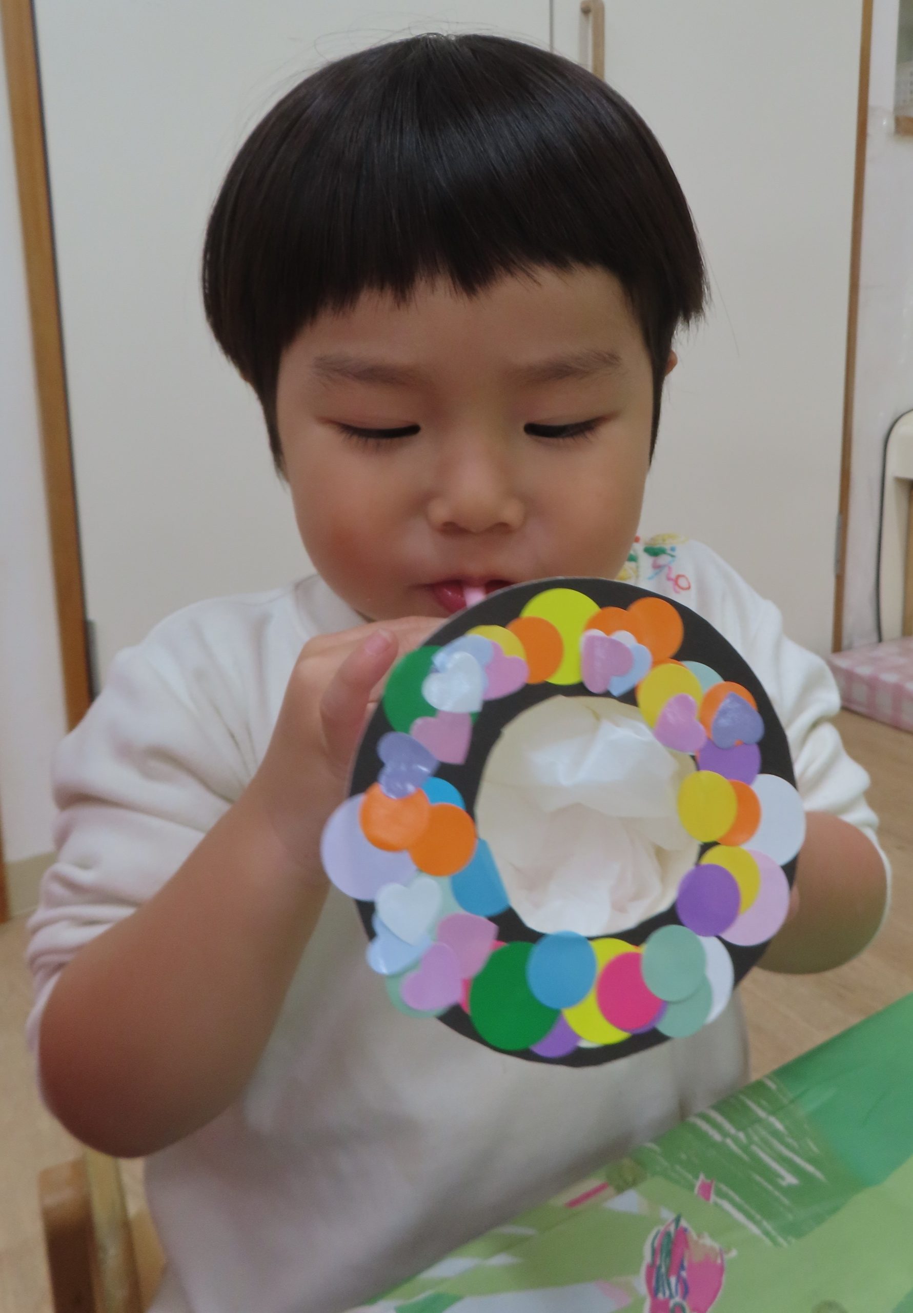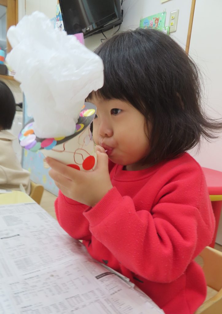 シールをたくさん貼った後は、ストローに息を吹き込み、お餅が膨らんだいきます。自分で作った玩具なので、さらに楽しさが倍増し、夢中で遊んでくれました✨