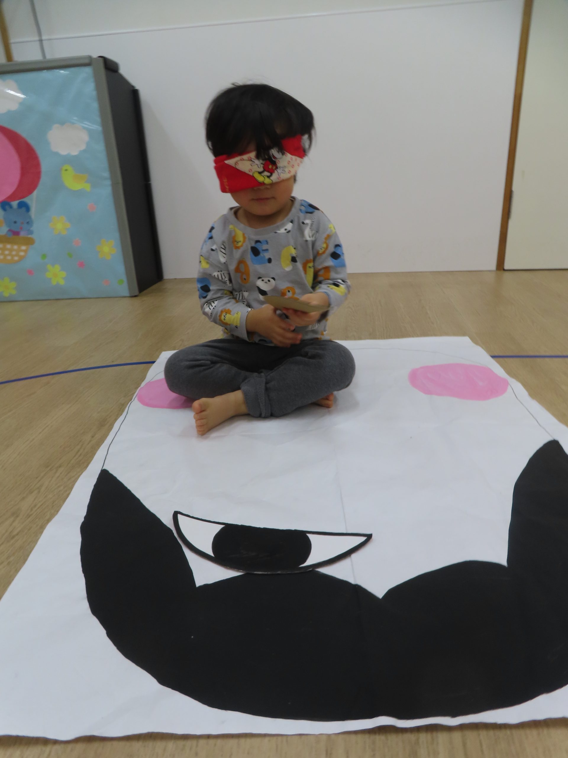 ぞう組さんは、目隠しで挑戦する子もいました。目隠しをずらして、位置を確認…👀