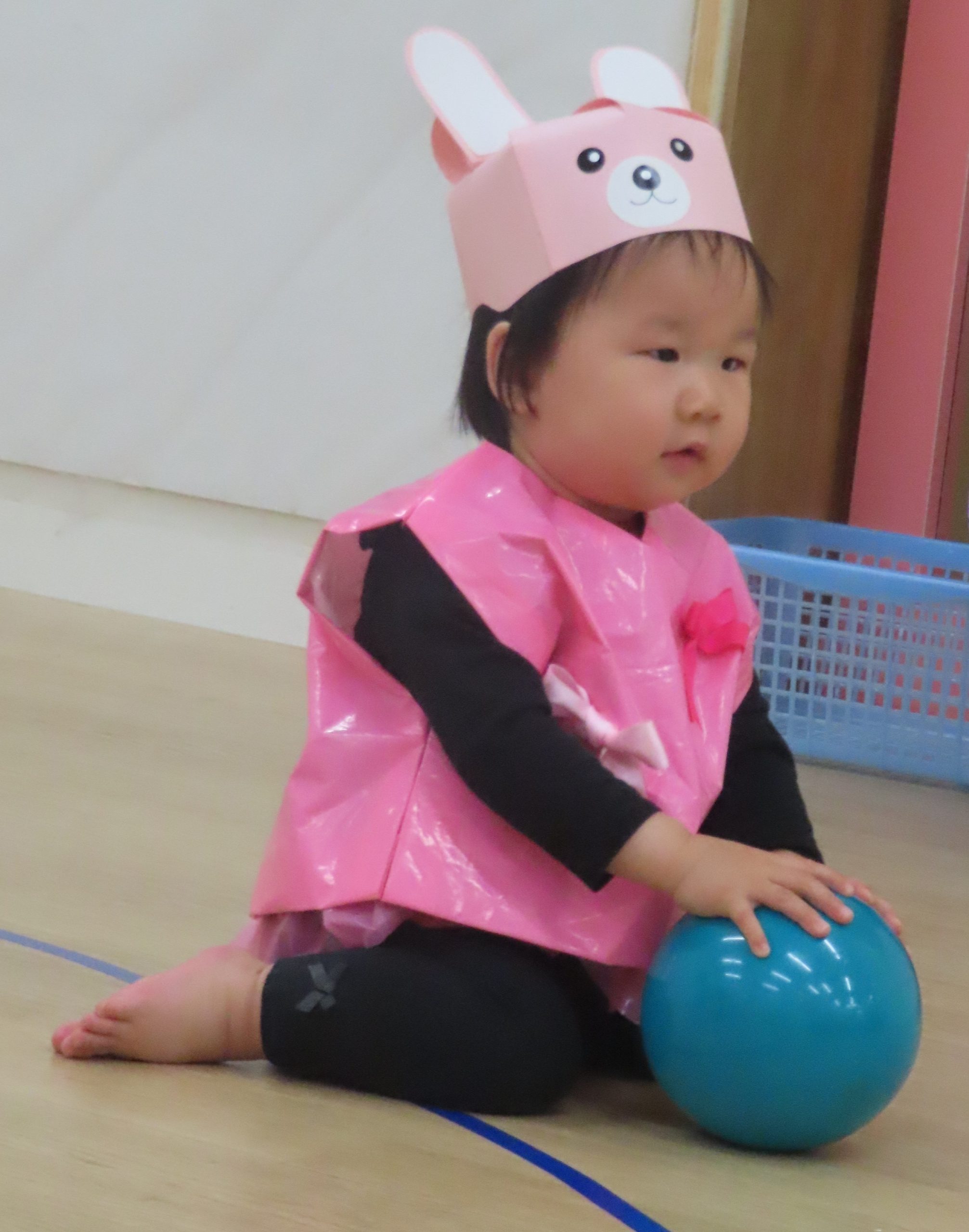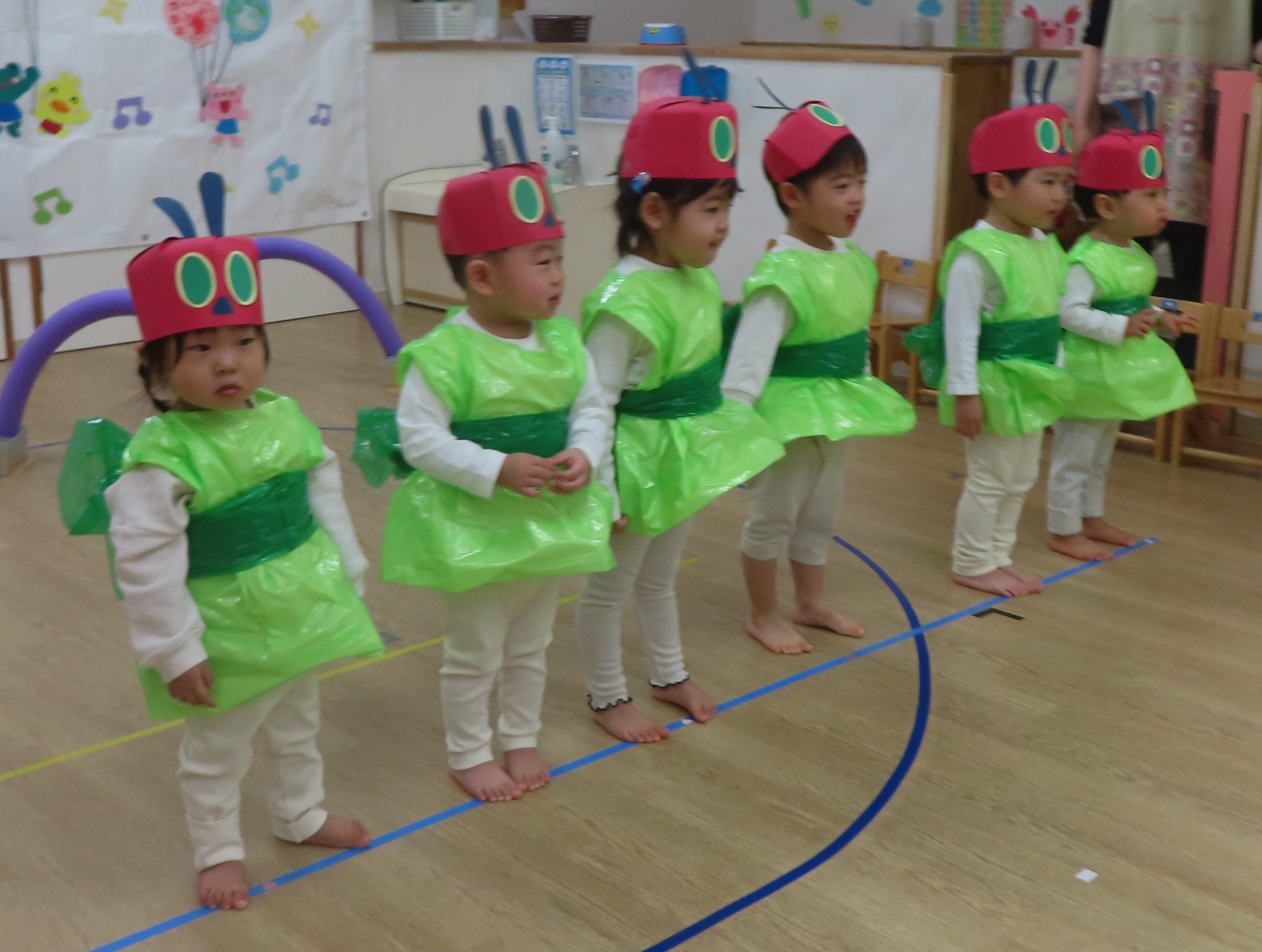 可愛いあおむしに大変身して、緊張の面持ちのうさぎ組さん。
