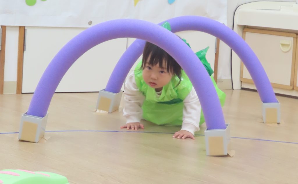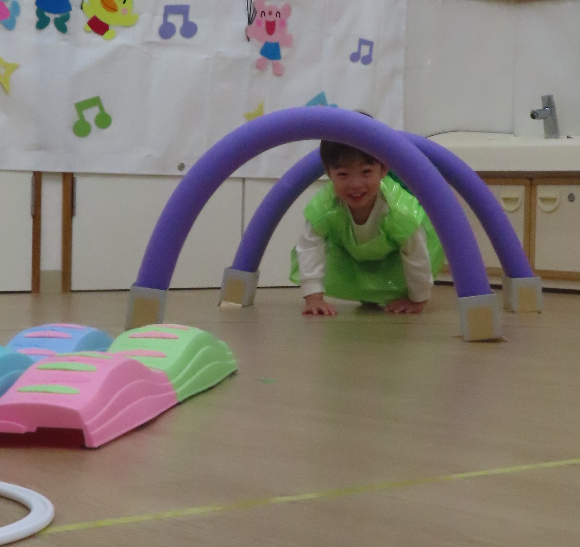 保育者にお名前を呼ばれた子から順番に、トンネルと平均台を披露!