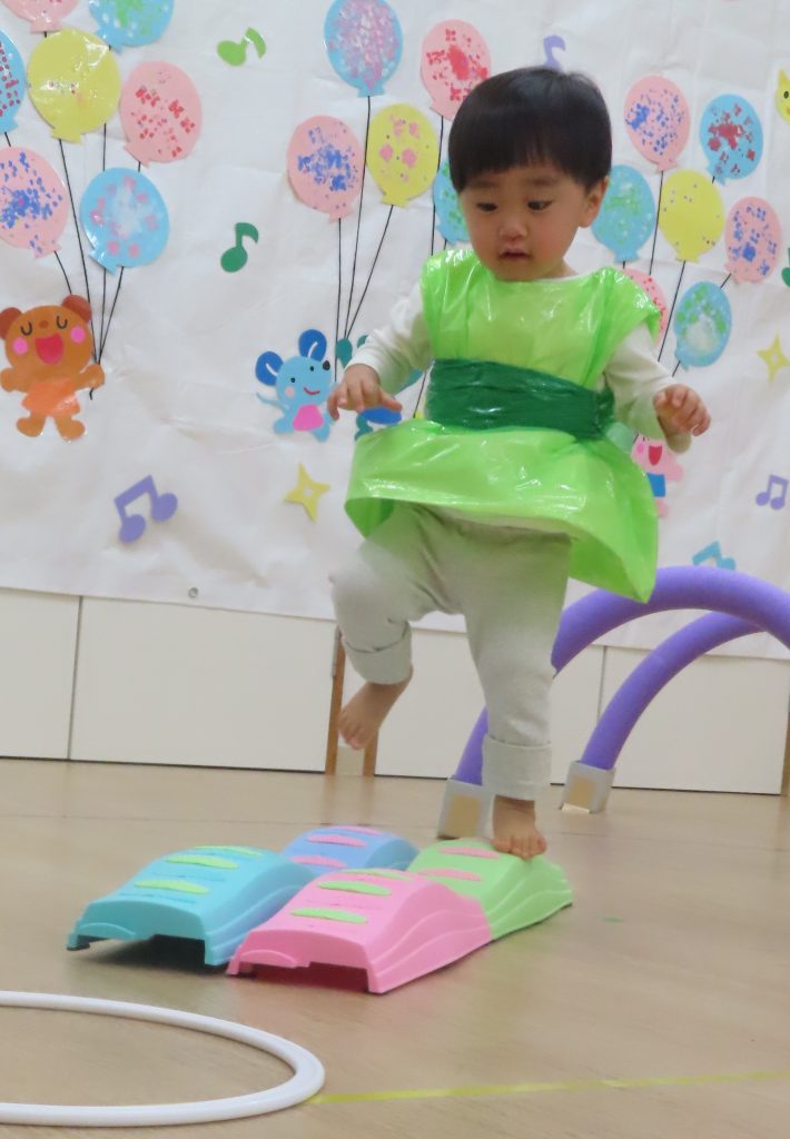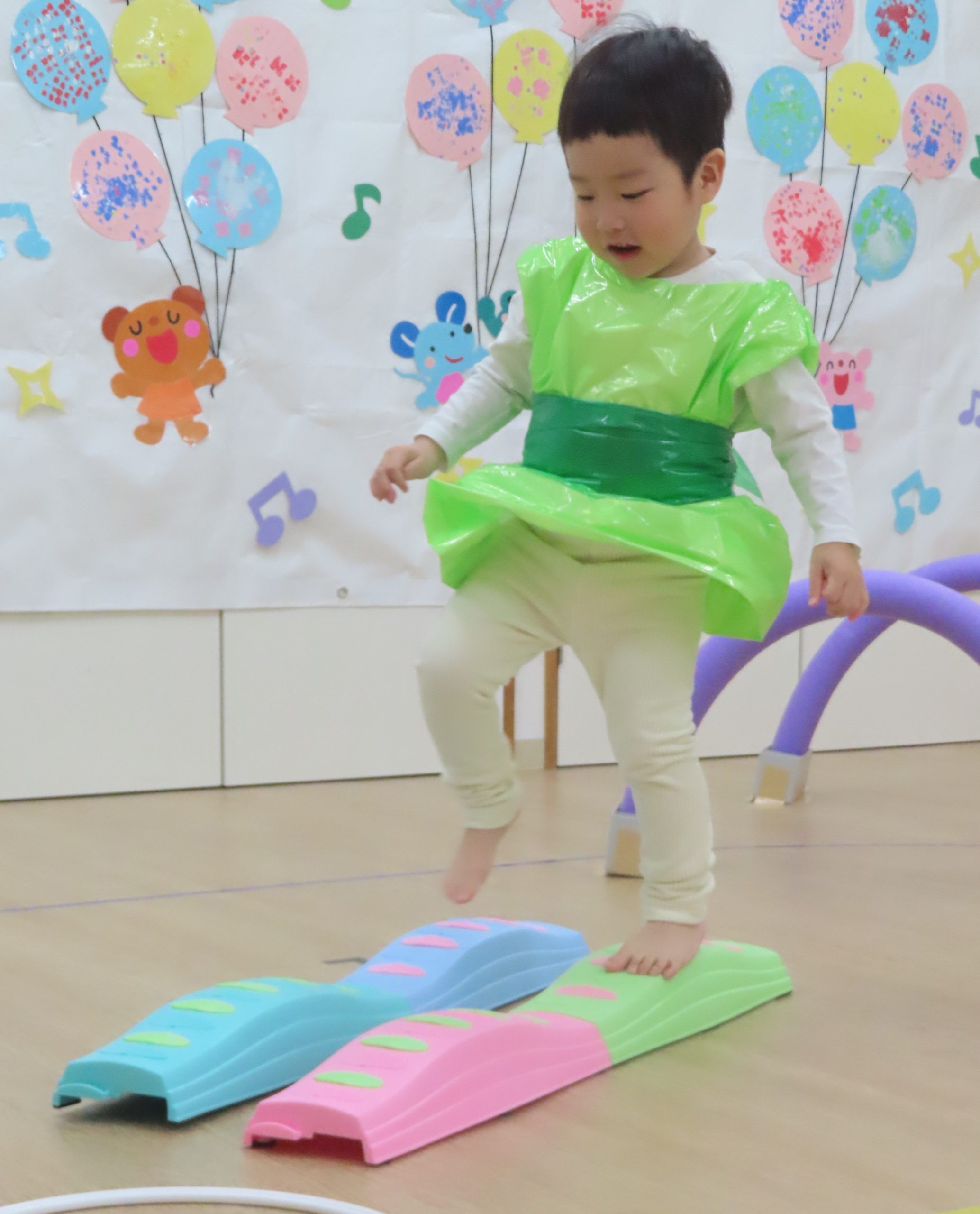 平均台は慎重に歩く子、片足を乗せる子と難しいながらも頑張りました♪