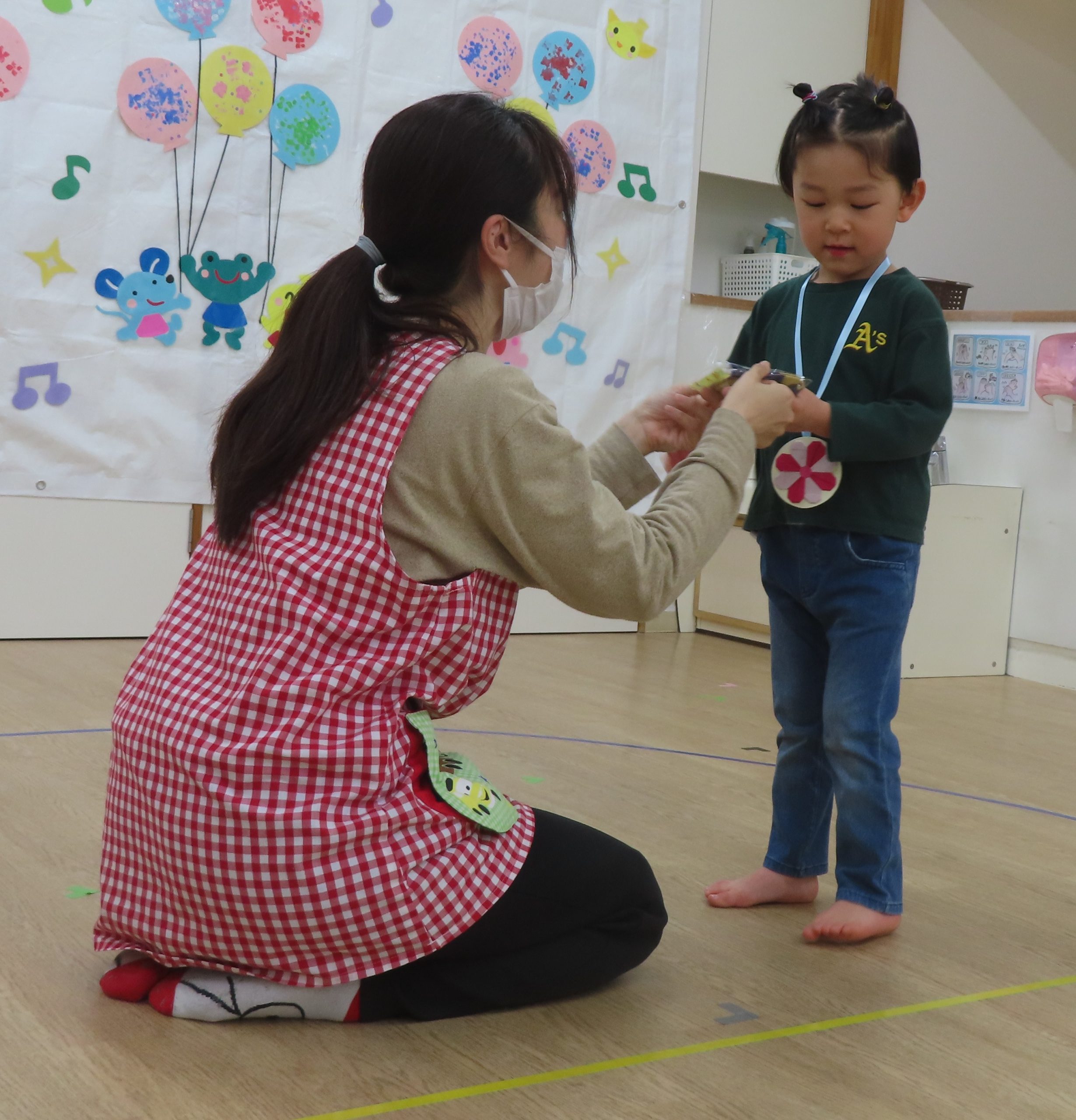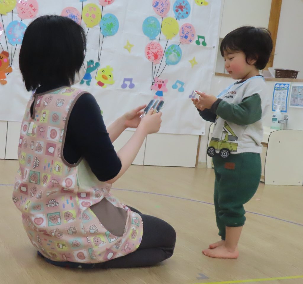 目の前の保育者のお手本を見ながら上手にまねっこできました!