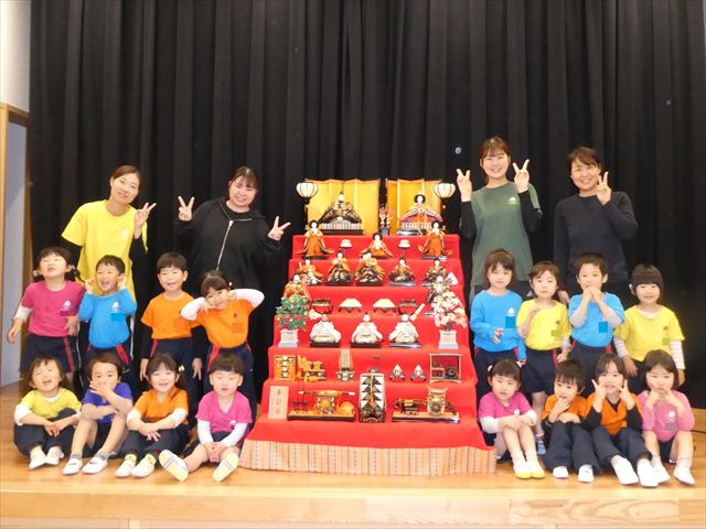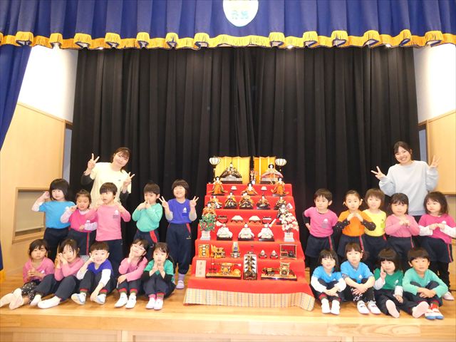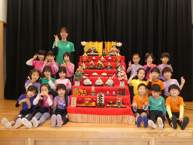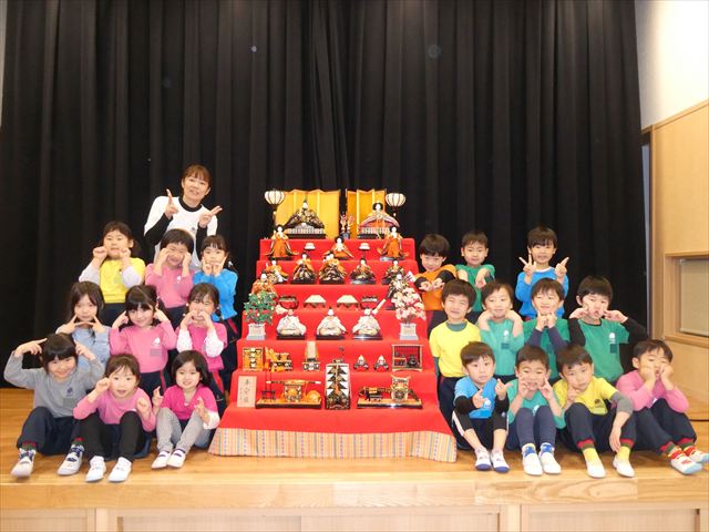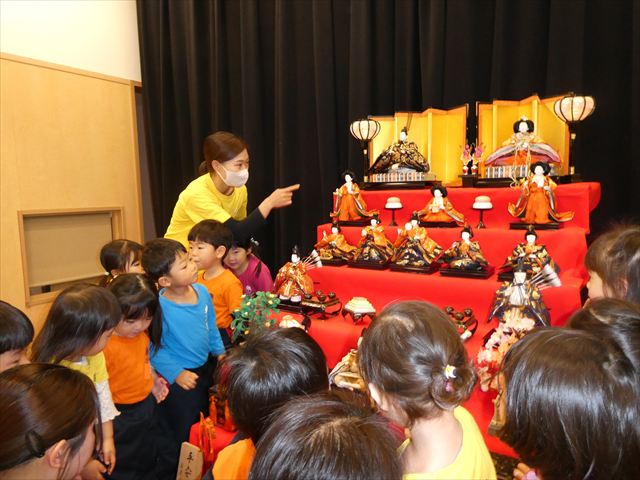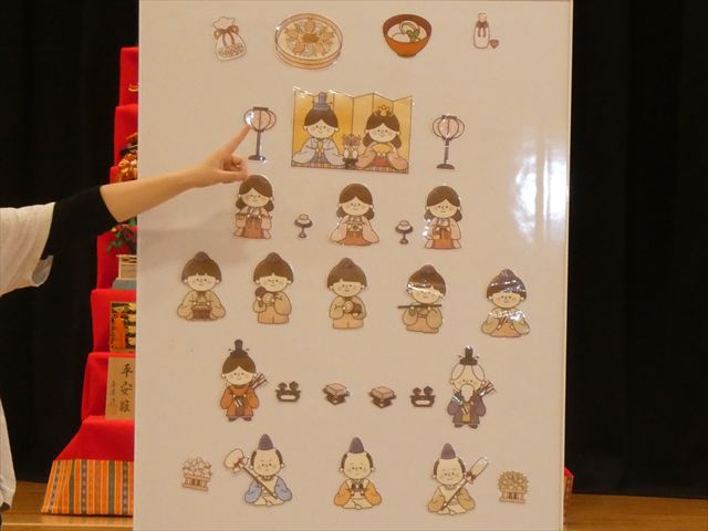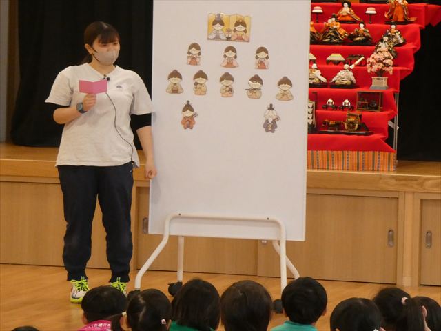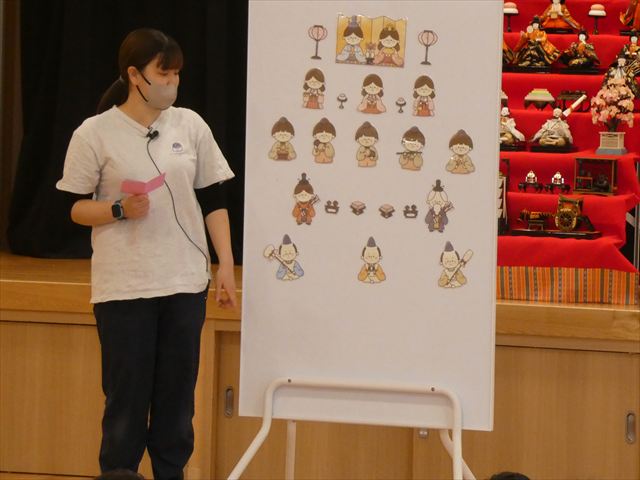 ひな人形の名前や役割、ひな人形を飾る意味や道具、ひなまつりについての由来など分かりやすく教えてもらい、子どもたちも興味津々でした(*’▽’)