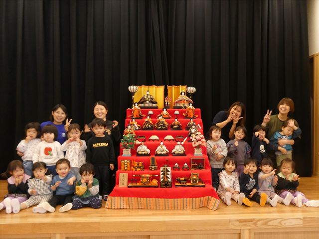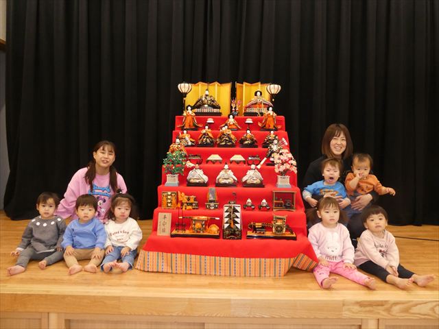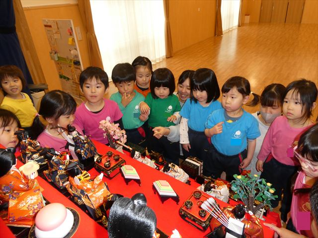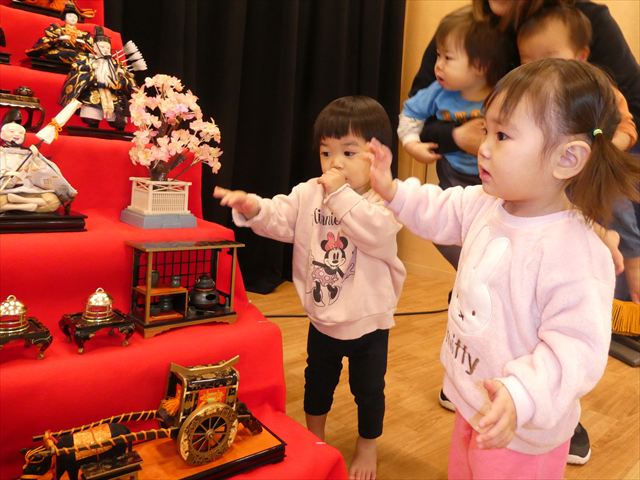 写真を撮った後は近くで雛飾りを見学!!人形の顔をじーっと見る子、色々な道具に興味を持つ子、「バイバ~イ!」と手を振る子など様々な様子が見られました(*^-^*)