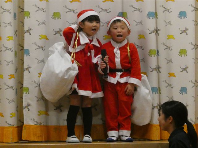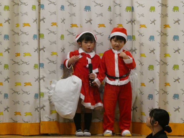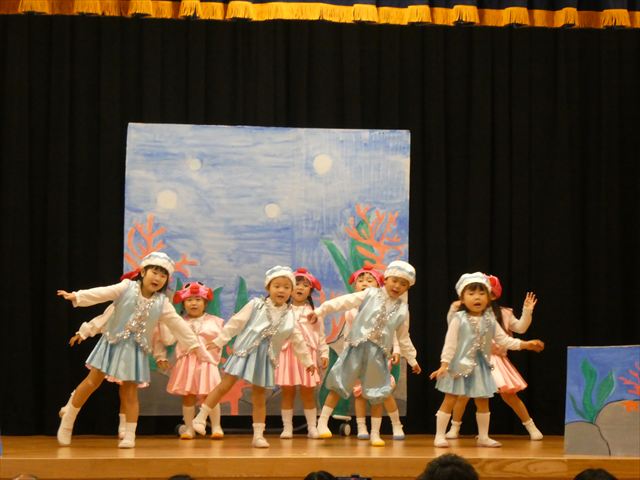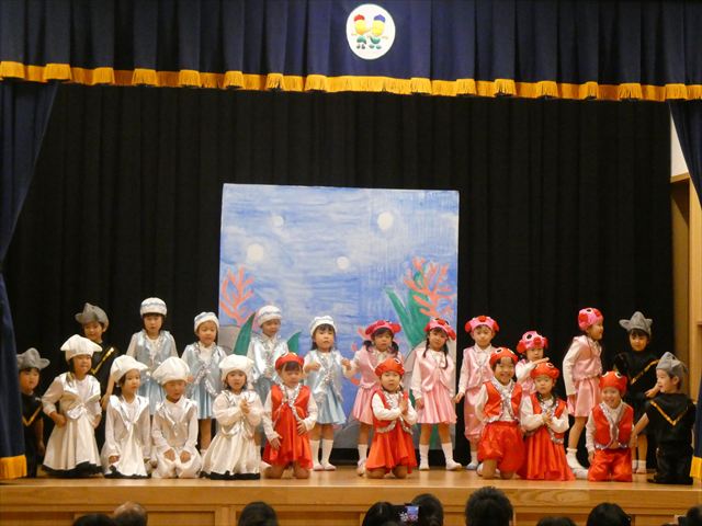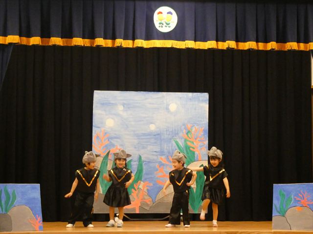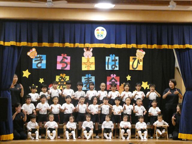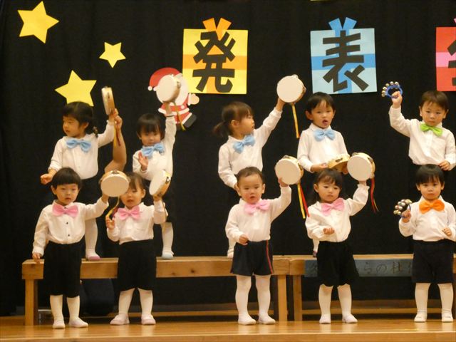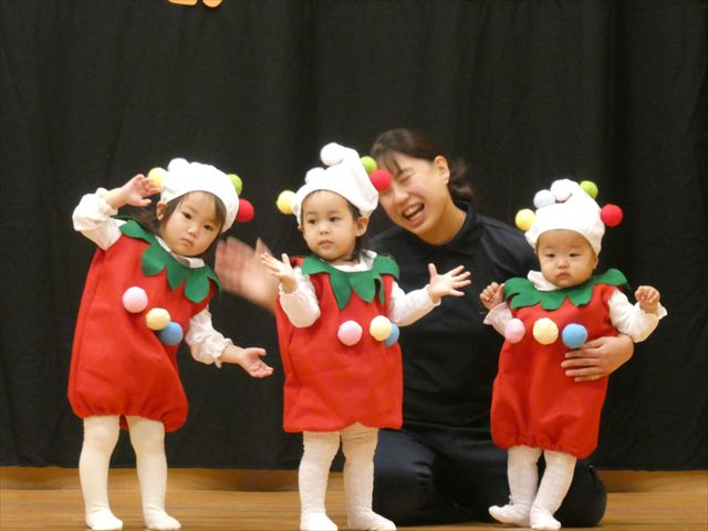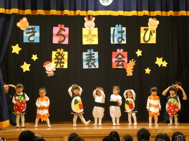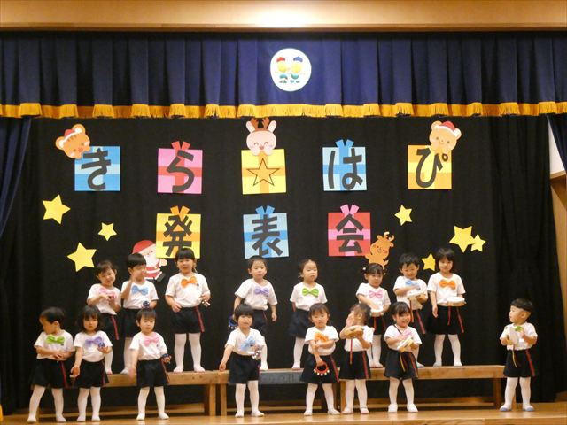 発表会当日は欠席者もなく全員参加で迎えることができ、私たち職員も嬉しかったです(^-^)登園時は泣いている子もいましたが、ステージの上ではみんな泣かずに発表することができ、とっても素晴らしかったです☆緊張している子、元気いっぱいに張り切って行う子、笑顔で楽しむ子と様々な子どもたちの姿が見られましたが、おうちの方々の温かいまなざしや手拍子、たくさんの拍手が子どもたちにとって大きな力となり練習の成果を十分に発揮していました!!