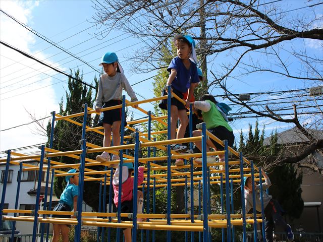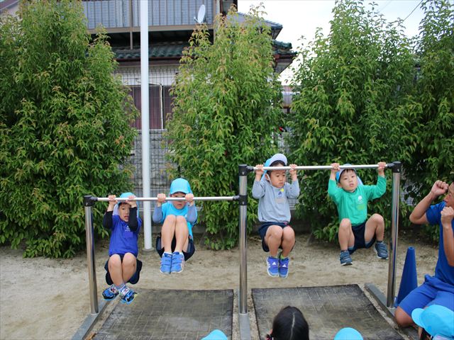 苦手な子も多く、鉄棒を見た時の子どもたちの顔は様々な表情でした。地面から足が離れる恐怖と闘っているお友だちもいましたが頑張って取り組んでいました。