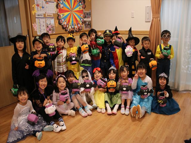 ハロウィンパーティーでは色々な衣装を着て、楽しそうに見せ合いっこをしていました。